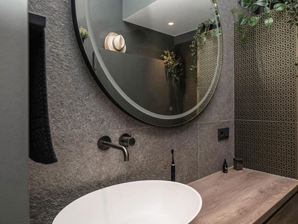 On the other side of the house is a very large second bedroom, equipped with beautiful built-in wardrobes and also an ensuite bathroom. This bathroom has a freestanding bath and beautiful patio doors to the garden with a private location. This second bathroom is also equipped with a unique design and is equipped with a walk-in shower and beautiful washbasin furniture. This bathroom is of course also equipped with luxurious Hot Bath built-in taps and again Kronos tiles. The guest toilet is located between the hall and the second bedroom.