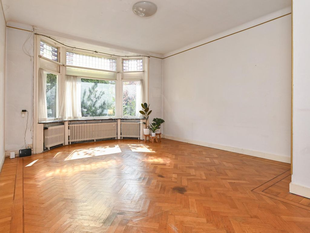 Front garden, entrance through vestibule with original wall and floor tiles, hallway with herringbone parquet flooring, meter cupboard (8 circuits, no earth leakage switch), dry cellar with boiler room and central heating system (Remeha Quinta, 2003). Guest toilet with washbasin. Dated kitchen with original wall tiles and access to the back garden. Dining room with herringbone parquet and French doors to the garden, connected via sliding doors to the living room with bay window and marble window sills.