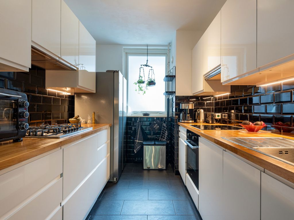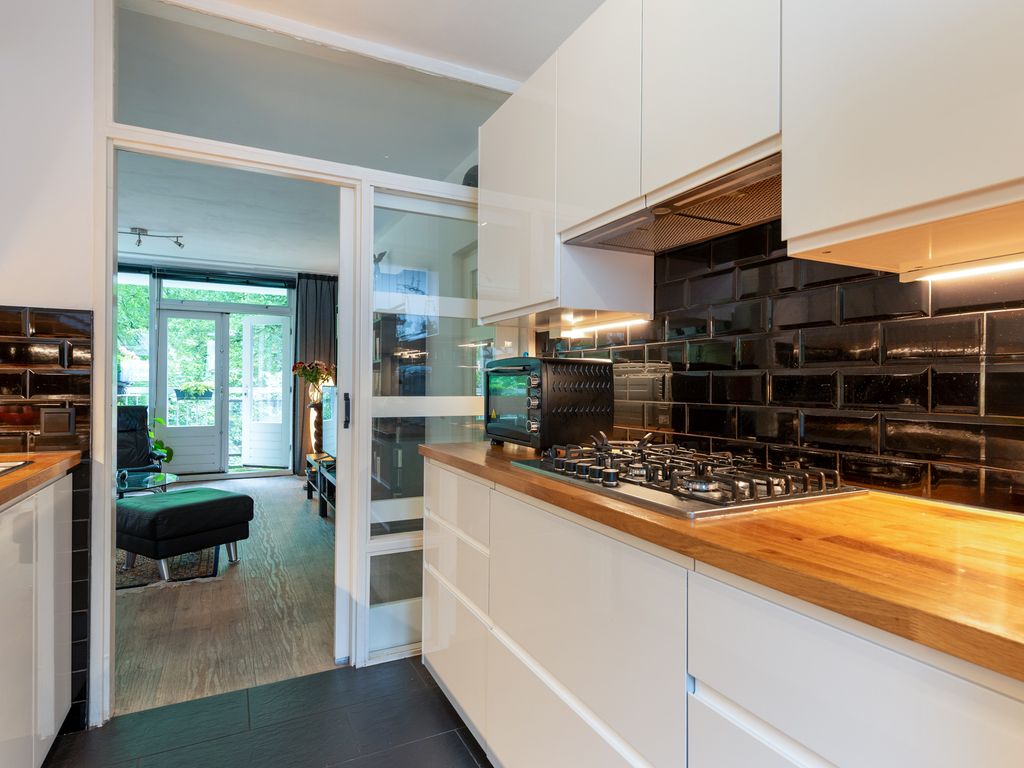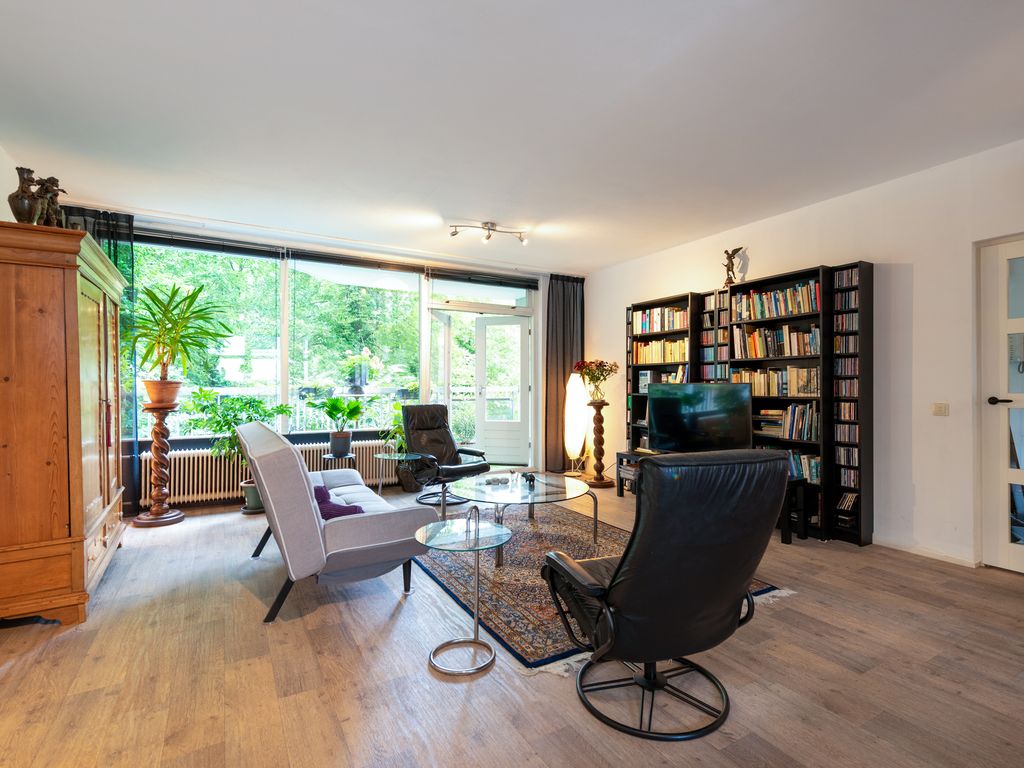 De ruime woon-eetkamer met lichtinval aan beide zijden heeft aan de boskant openslaande deuren met toegang tot het balkon dat over de gehele breedte van het pand loopt (10,5 m). De aangrenzende moderne keuken heeft inbouwapparatuur zoals een elektrische oven en elektrisch keramische kookplaat, een extra 5-pits gaskookplaat, dubbeldeurs Amerikaanse ijskast en vaatwasser.