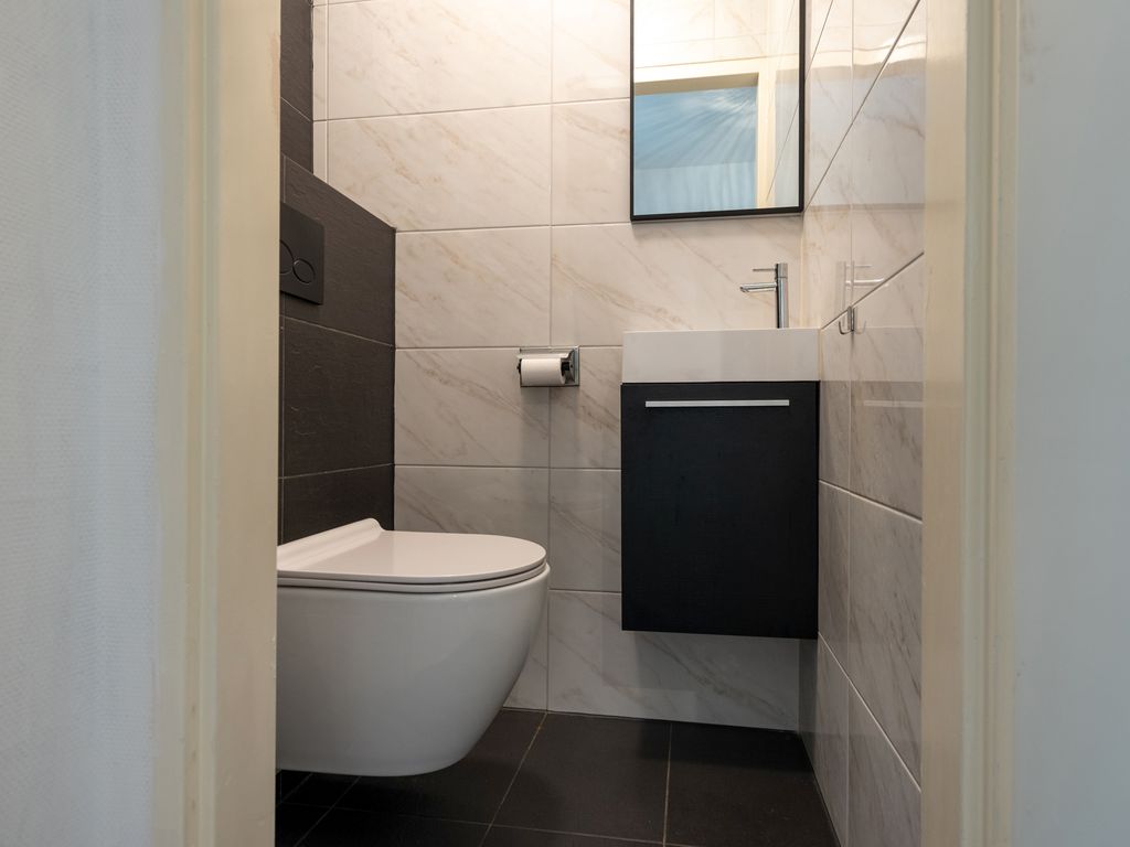 Verder is er nog een modern toilet met fonteinkastje. Alle deuren die op de hal uitkomen hebben glas hetgeen de ruimte van dit appartement nog accentueert. Het hele appartement heeft een vinylvloer.