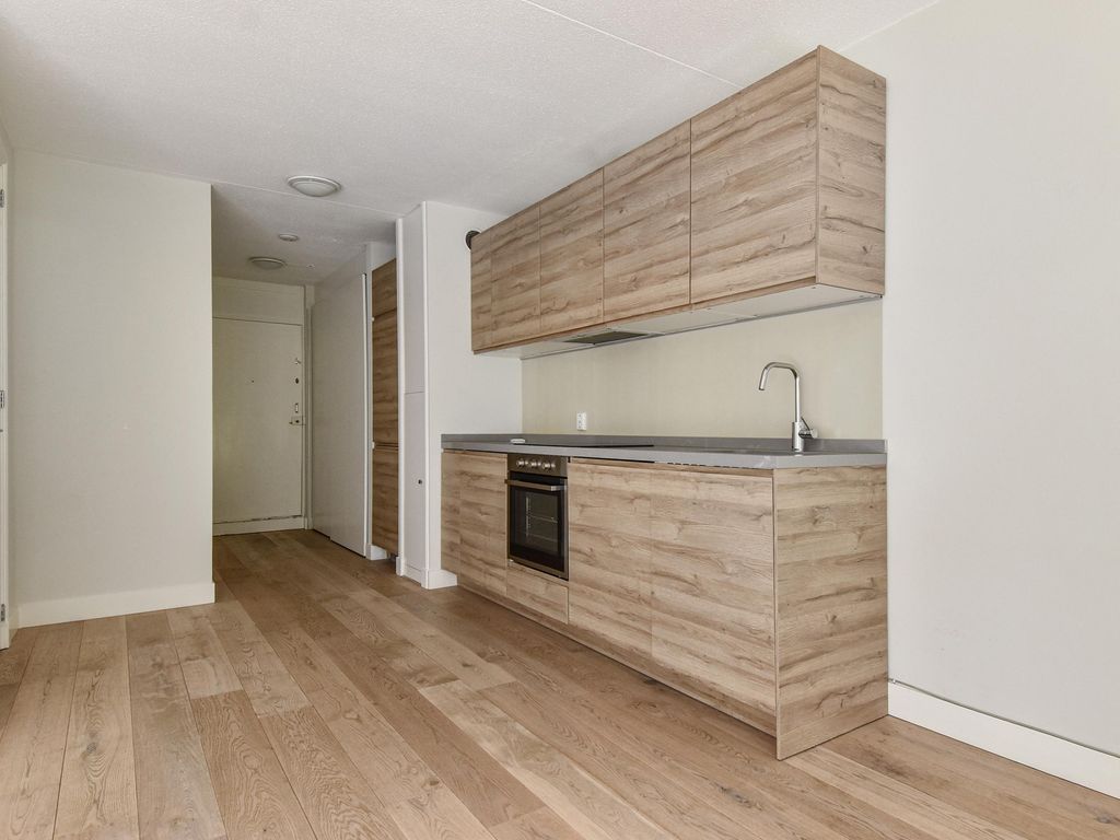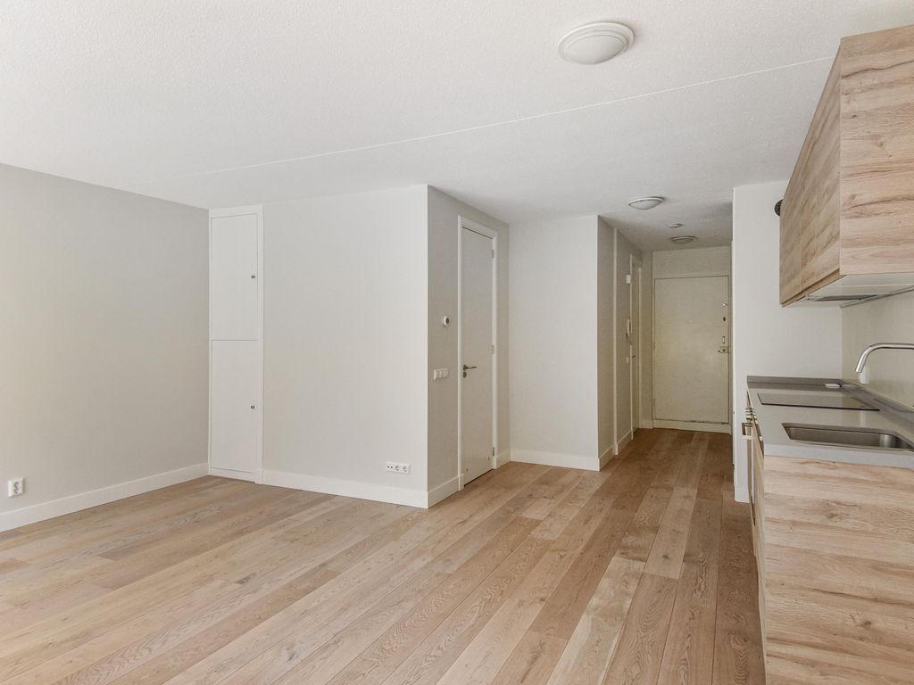 Entree appartement: hal, slaapkamer, badkamer met douche, wastafel en toilet, woonkamer met open keuken inclusief apparatuur en toegang naar balkon. Berging in de onderbouw.
