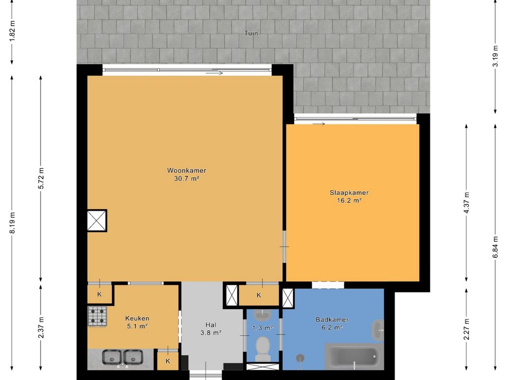 Vanuit de woon-/eetkamer toegang tot de slaapkamer met eveneens een schuifpui naar het terras. Vanuit de slaapkamer toegang tot de ruime badkamer met ligbad, separate douche en wastafel. Het toilet bevind zich tussen de hal en de badkamer waardoor deze vanuit beide ruimtes te bereiken is.