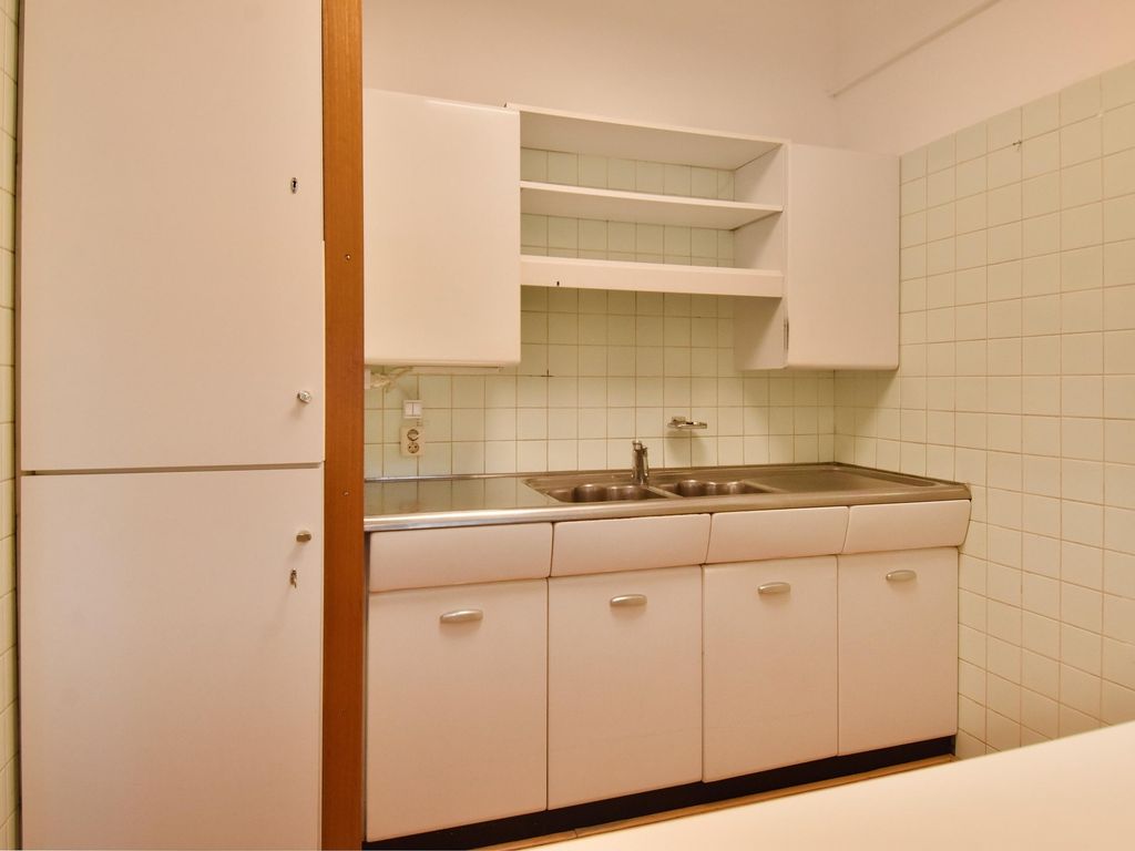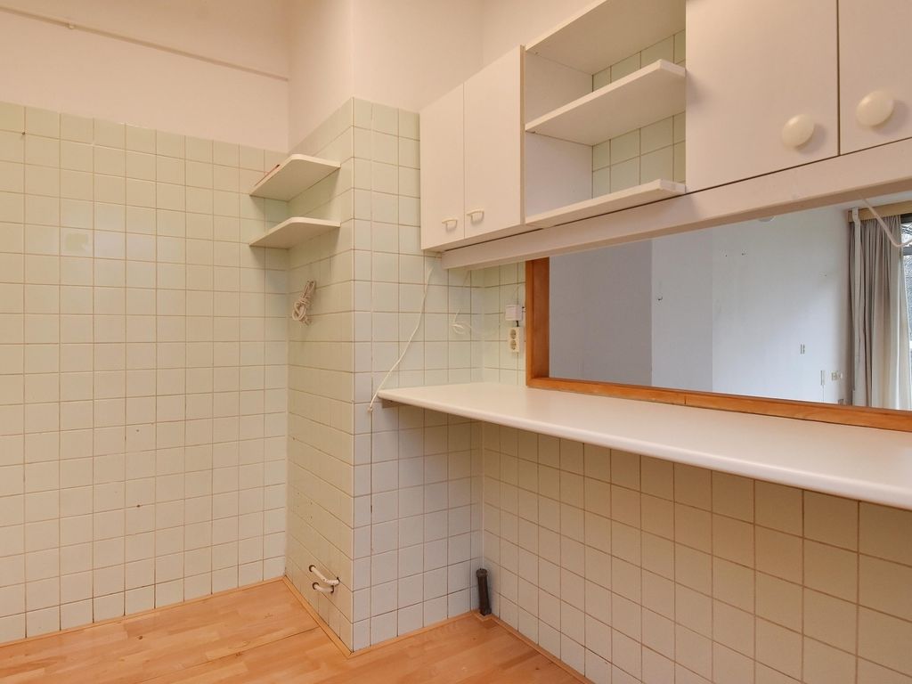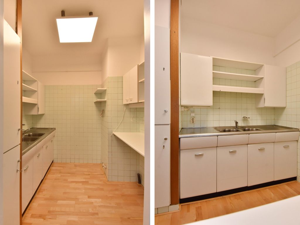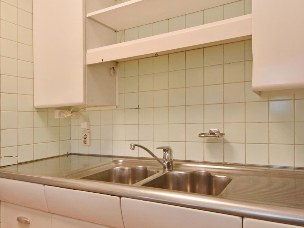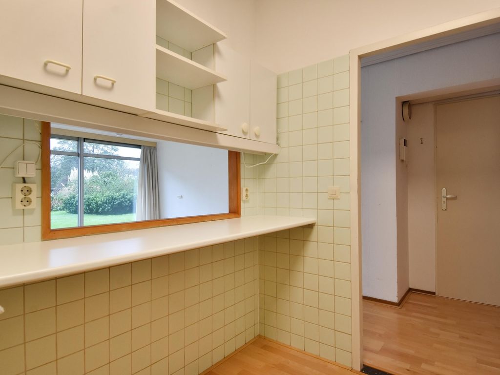 De separaat gelegen keuken is eenvoudig maar de ruimte biedt mogelijkheden tot het plaatsen van een uitgebreide keuken. Exceptioneel is dat er hier een gedeeltelijke doorbraak van de muur mogelijk was om de keuken deels te verbinden met de woonkamer.