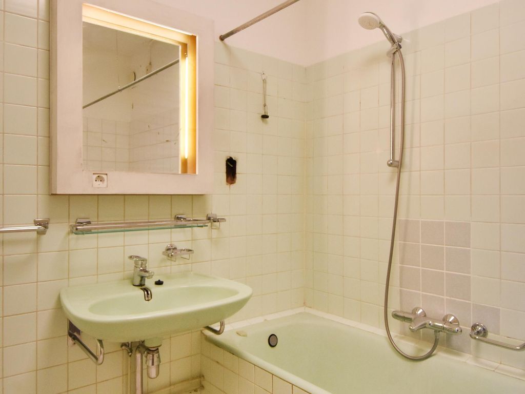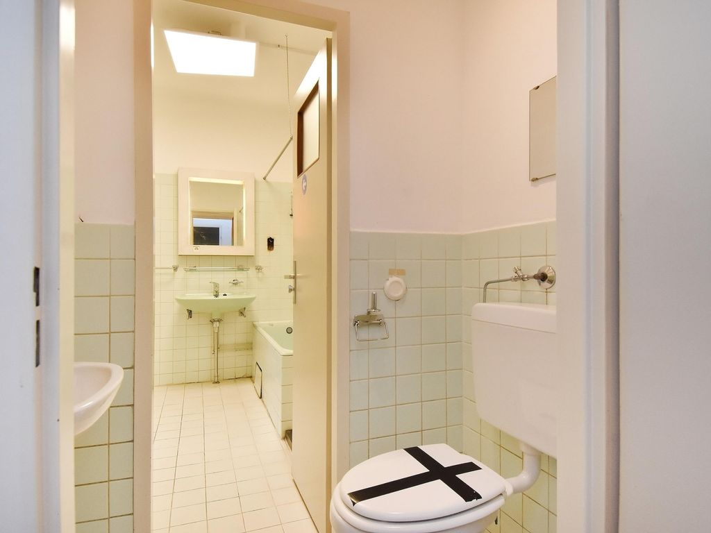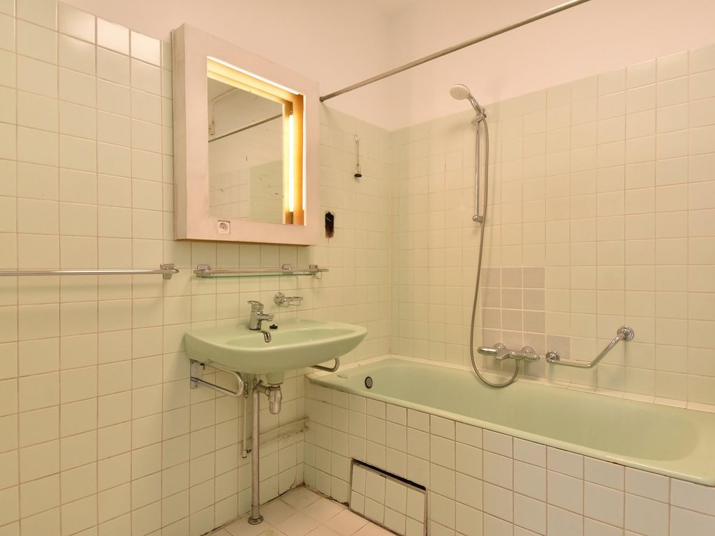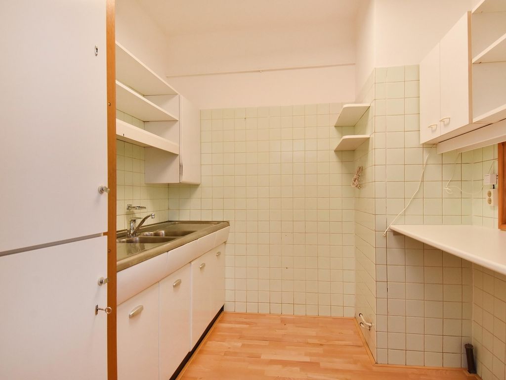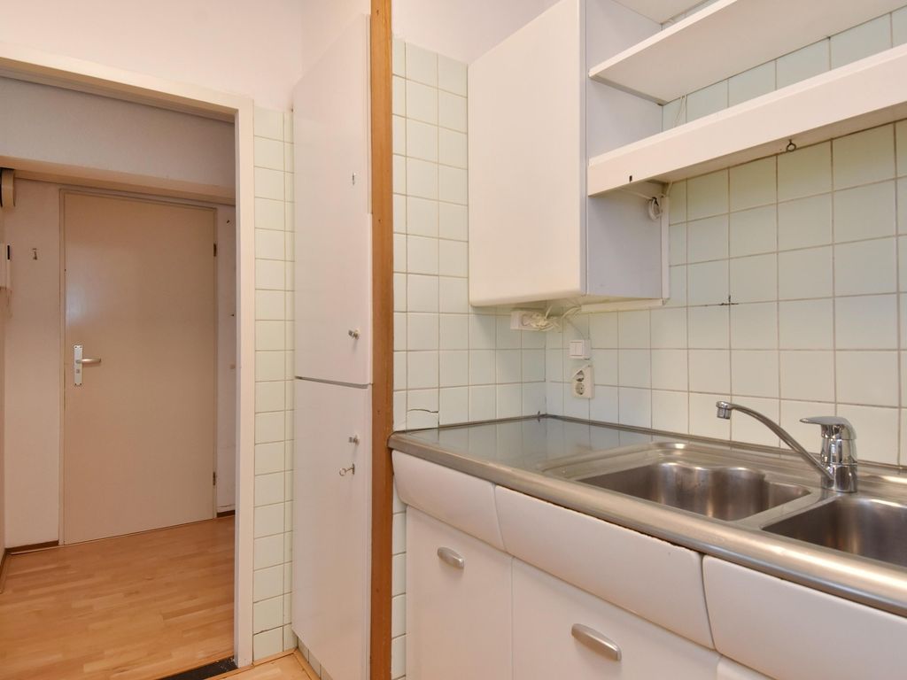 De separaat gelegen keuken is eenvoudig maar de ruimte biedt mogelijkheden tot het plaatsen van een uitgebreide keuken. Exceptioneel is dat er hier een gedeeltelijke doorbraak van de muur mogelijk was om de keuken deels te verbinden met de woonkamer.