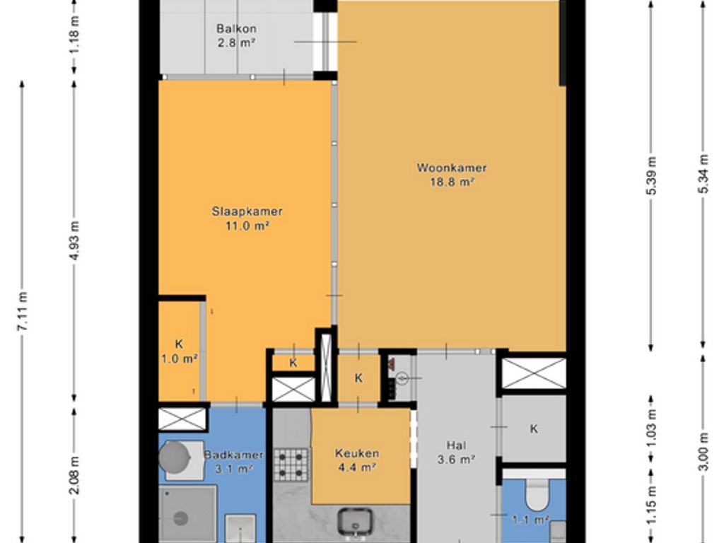 De keuken, woonkamer en slaapkamer zijn voorzien van een goed geïsoleerde strakke laminaatvloer. De wc en de badkamer hebben granito vloeren.