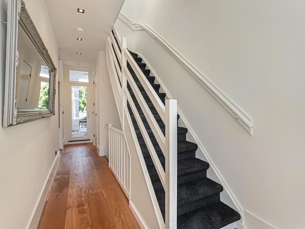 Stairs to the second floor: landing, strip parquet flooring, built-in cupboard with washing machine connection and Intergas combination boiler, modern toilet with hand basin, master bedroom with radiator covers, central modern bathroom with walk-in shower, vanity unit, freestanding bath, and heated towel rail, front bedroom with strip parquet flooring and radiator covers. Two additional rooms on each side of the hallway can be used as offices, small bedrooms, or walk-in closets.