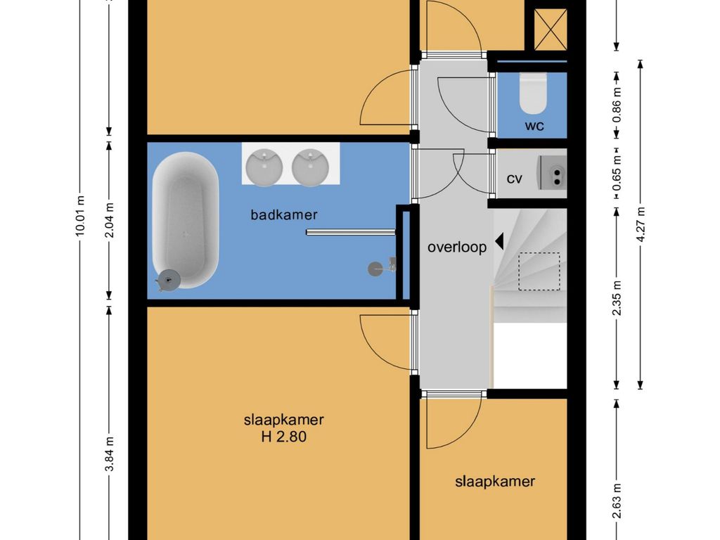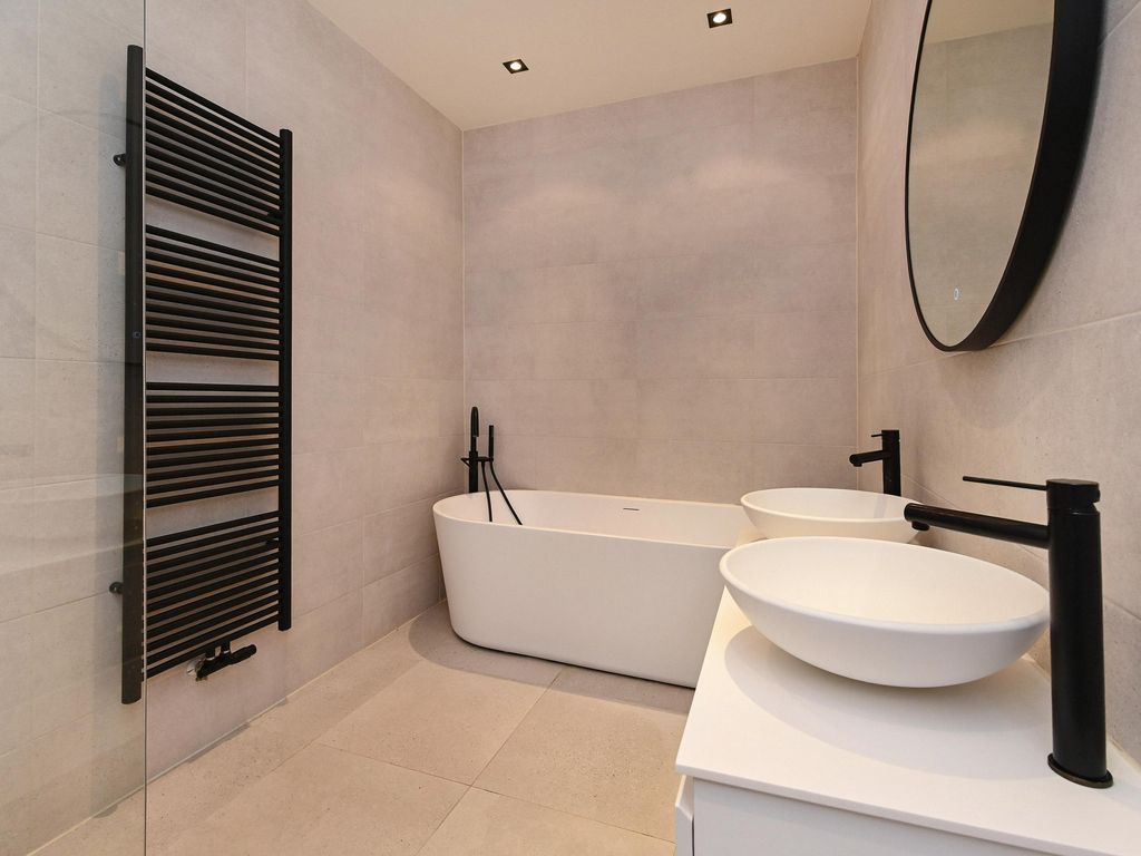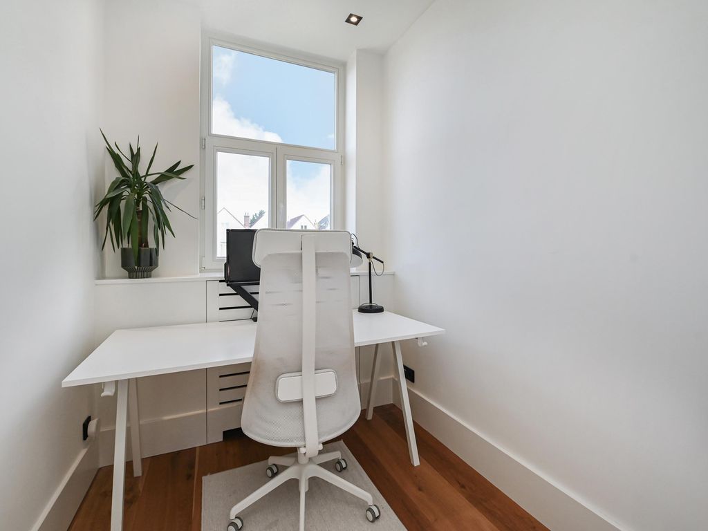 Trap naar de 2e etage: overloop, stroken parket, vaste kast met wasmachineaansluiting en Intergas combiketel, modern toilet met fontein, achterzij(studeer)kamer, hoofdslaapkamer met radiatorombouwen, centrale moderne badkamer met inloopdouche, wastafels met meubel, losstaand bad en handdoekradiator, voorslaapkamer met stroken parket en radiatorombouwen, voorzijkamer (thans in gebruik als studeerkamer).
