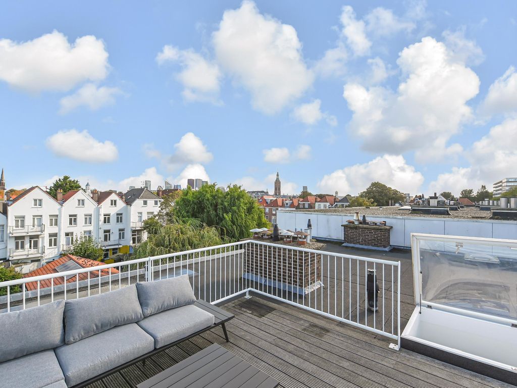 Vaste trap naar het dak met dakterras (ca. 3.20x3.80). Dakterras geeft ruim voldoende ruimte voor ontspanning met uitzicht op de Grote Kerk en de Haagse skyline.