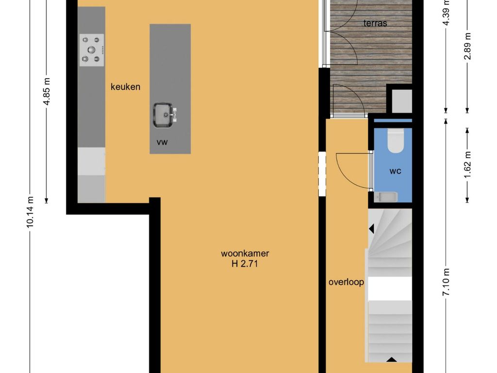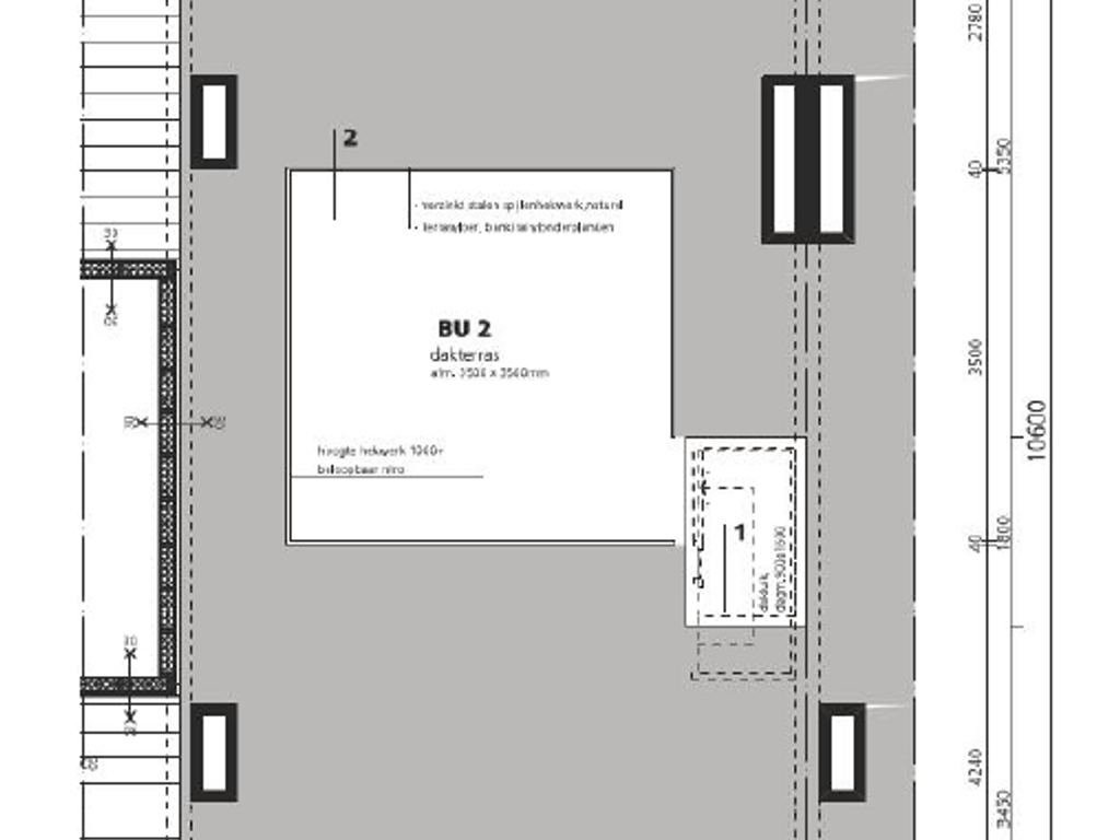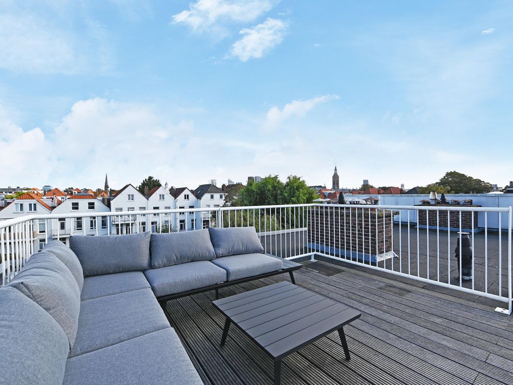 Fixed stairs to the roof terrace (approx. 3.20x3.80). Roof terrace provides ample space for lounging and relaxation, with views of the Grote Kerk and city center skyline.
