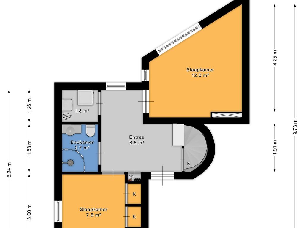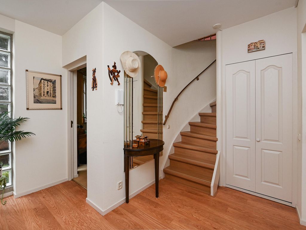 Entree, hal, trapkast, meterkast (7 groepen, aardlekschakelaar en 2-fase groep), hoekkamer met vaste garderobekasten, gastenbadkamer met hoekdouche, toilet en wastafel met meubel, diepe kast met Nefit HR combiketel en wasmachineaansluiting, studeerkamer;