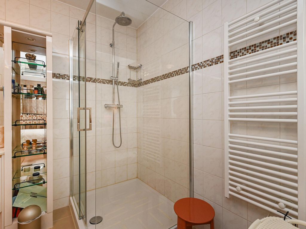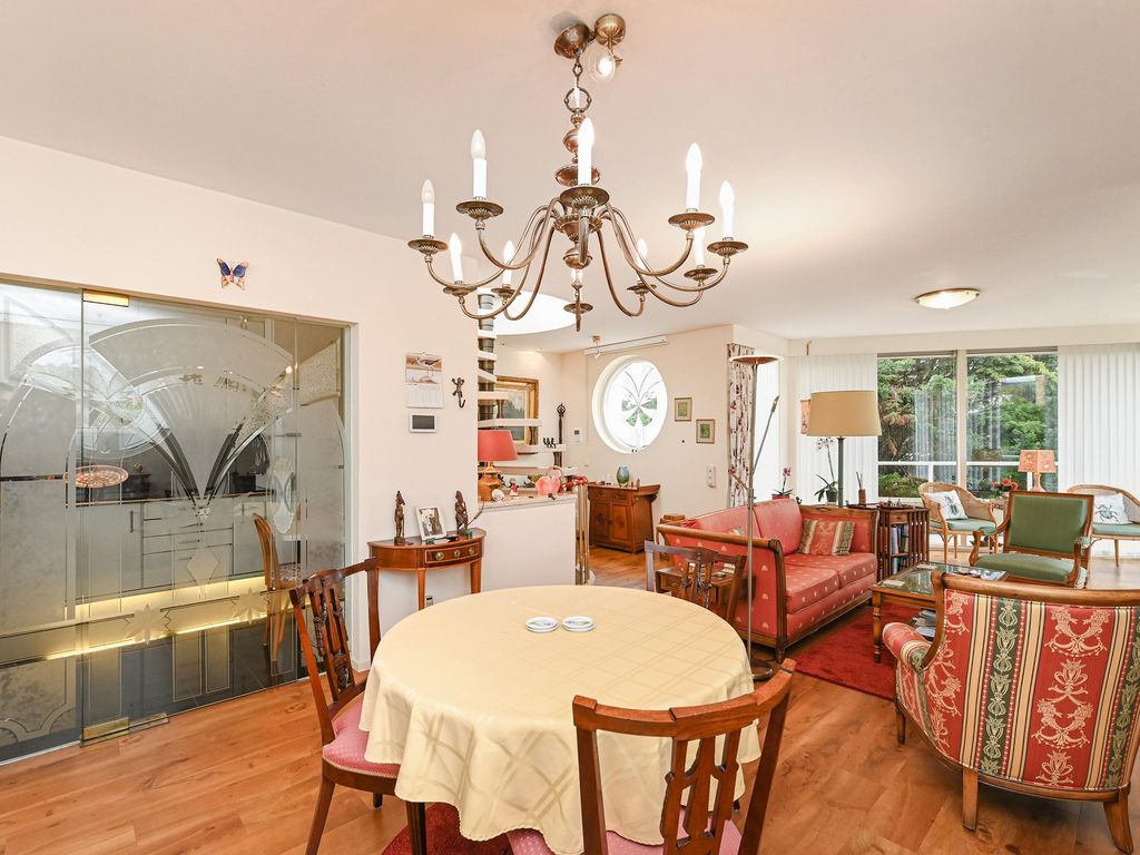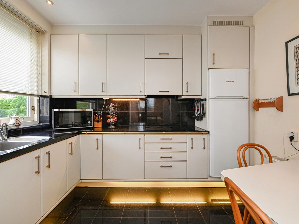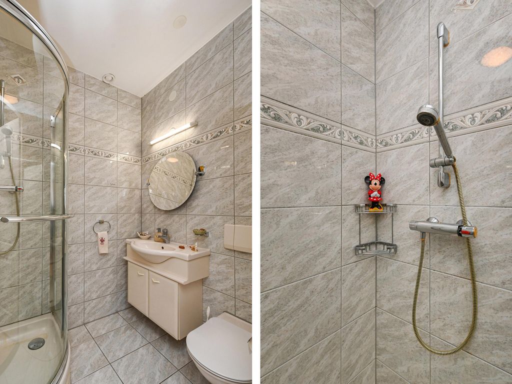 Overloop, slaapkamer met vaste kast, airconditioning, ruime hoekdouche, toilet, wastafel met meubel en vloerverwarming, woonkamer met ronde erker, schuifpui naar terras, pvc vloer, gashaard en eethoek, glazen deur naar de keuken voorzien van granieten aanrechtblad, vaatwasser, koelkast en inductie kookplaat.