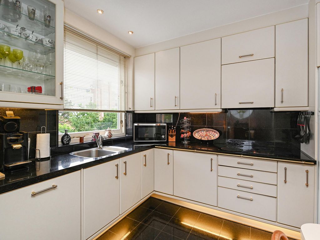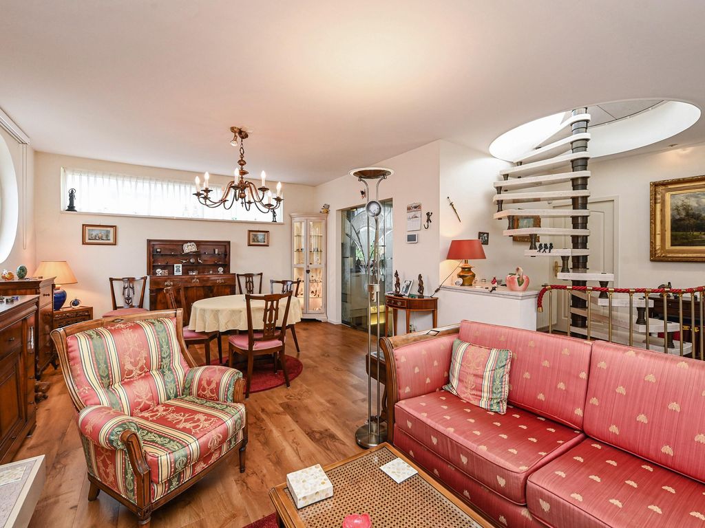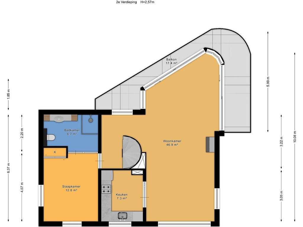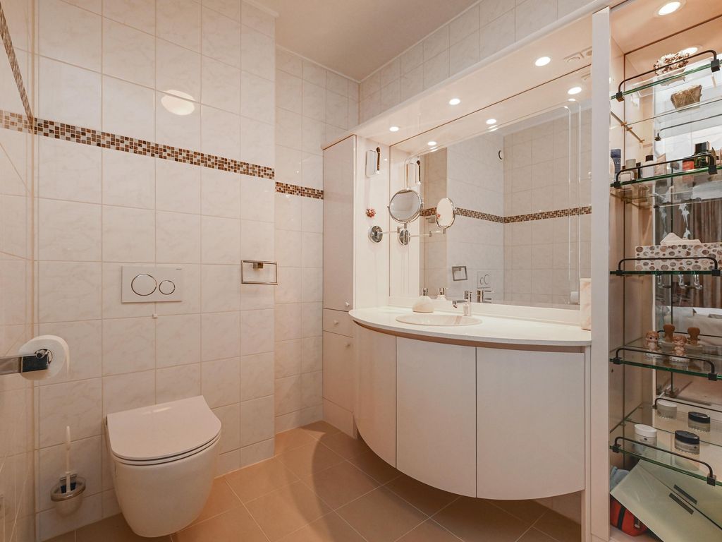 Overloop, slaapkamer met vaste kast, airconditioning, ruime hoekdouche, toilet, wastafel met meubel en vloerverwarming, woonkamer met ronde erker, schuifpui naar terras, pvc vloer, gashaard en eethoek, glazen deur naar de keuken voorzien van granieten aanrechtblad, vaatwasser, koelkast en inductie kookplaat.