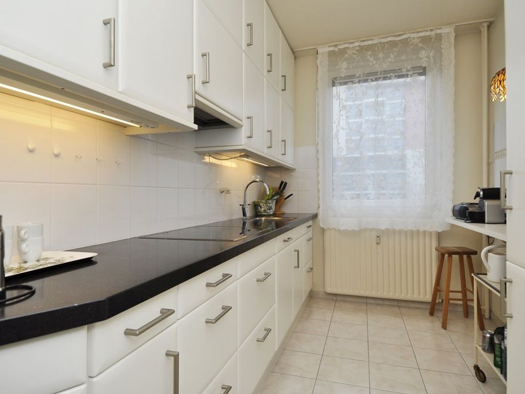 Aan de achterzijde bevindt zich de nette keuken, met veel werk- en bergruimte, diverse inbouwapparatuur.