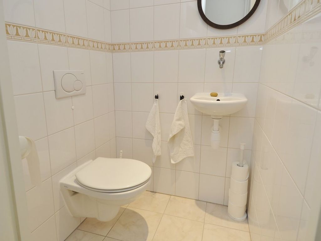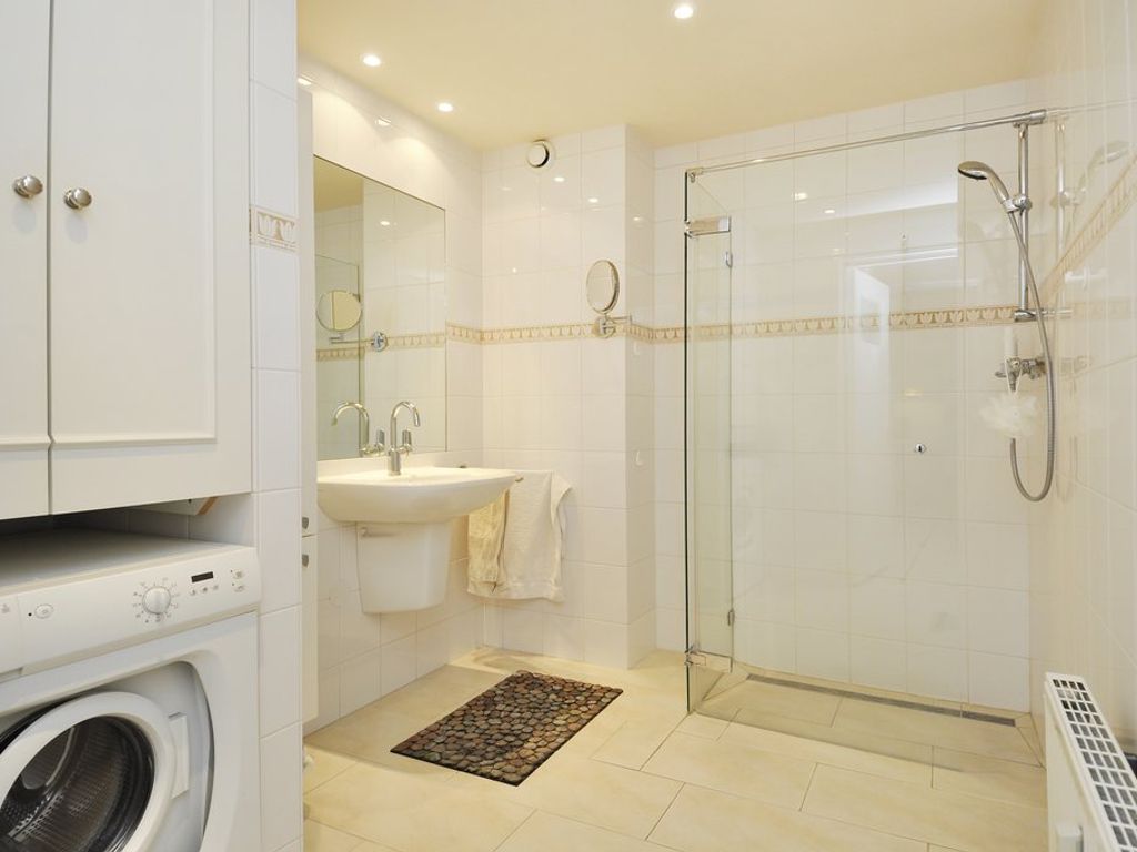 De volledig betegelde badkamer is voorzien van een inloopdouche, wastafel, en een afgescheiden ruimte voor wasmachine en wasdroger.