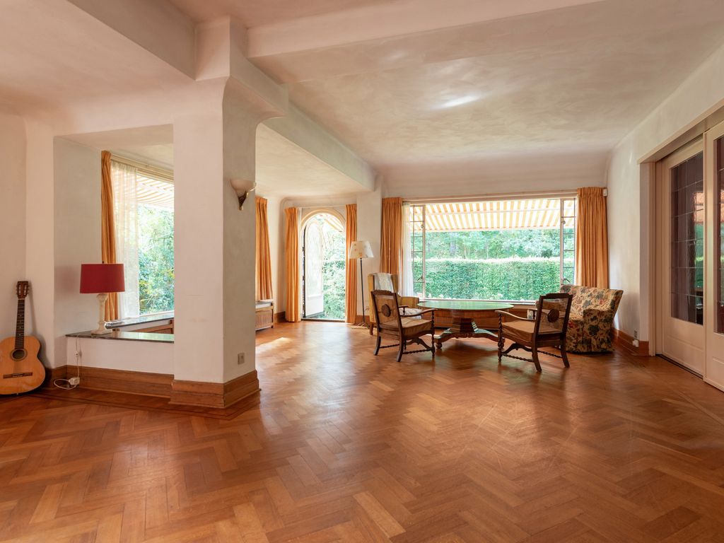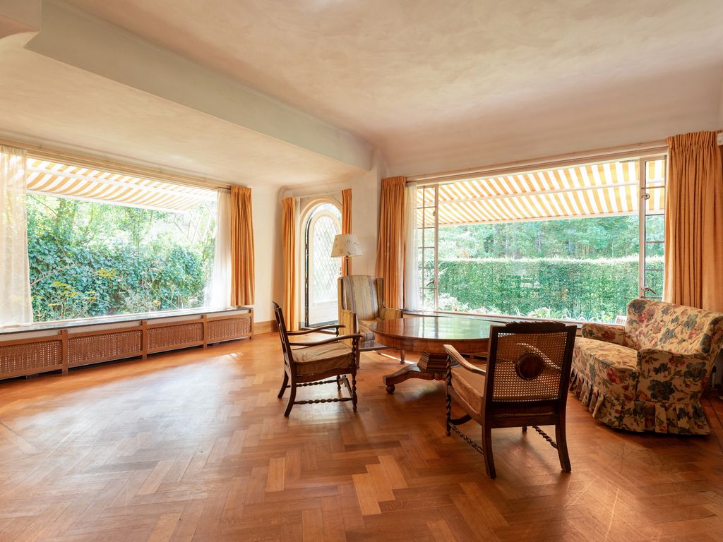 The garden wraps halfway around the house and is very sunny due to its free and open setting. In addition to the original garage, which was once connected to the dining room and could easily be reintegrated into the house, a newer, large garage has been added to the plot. This garage is suitable for many purposes, has an automatic overhead door, and provides passage to the back garden.