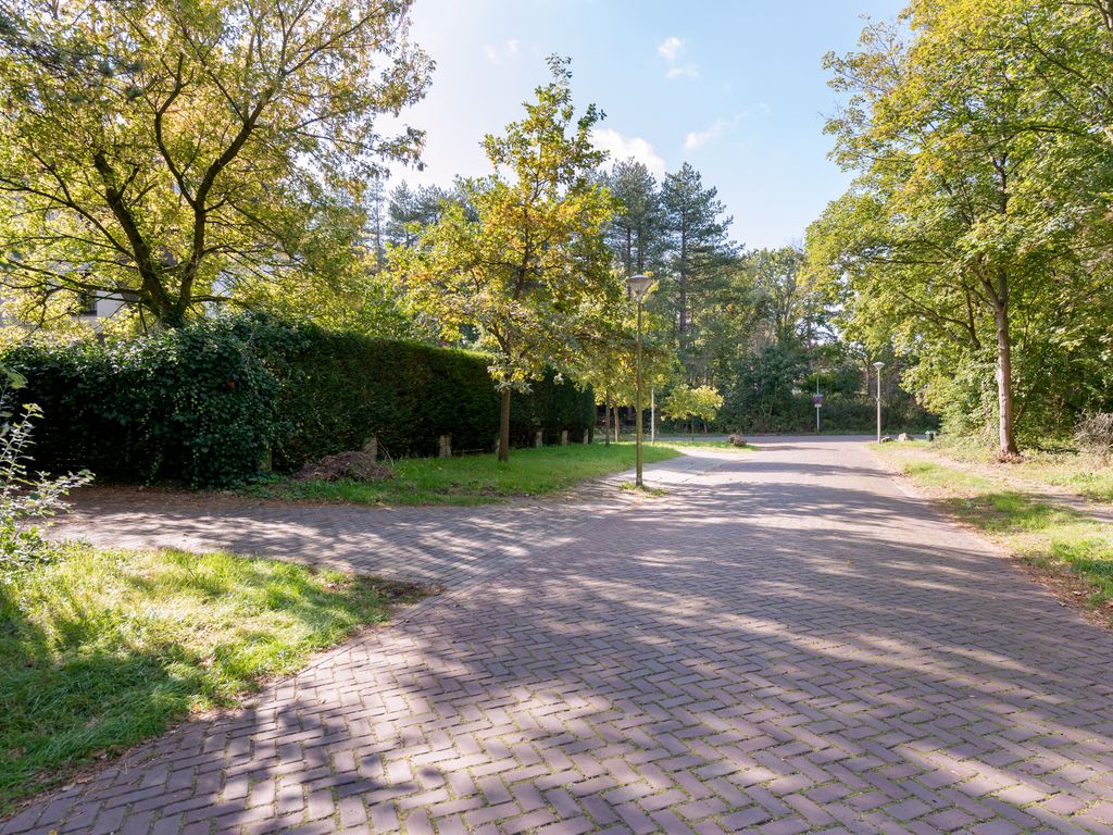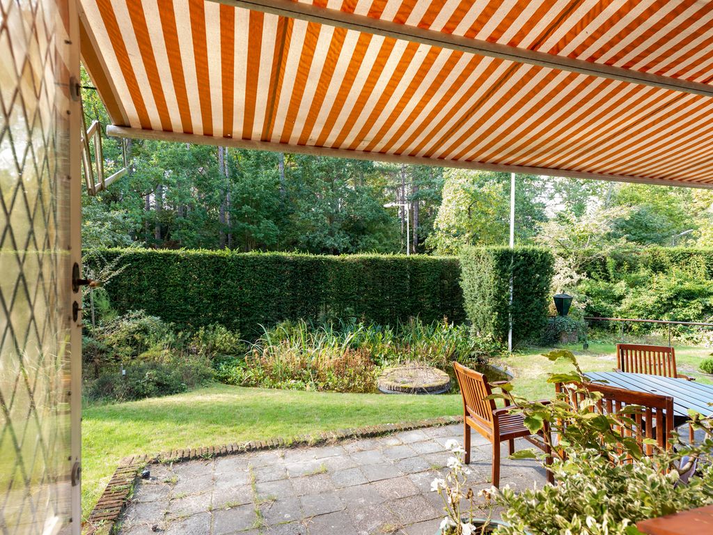 De tuin ligt half rondom de woning en is vrij gelegen en dus heel zonnig. Naast de oorspronkelijke garage die ooit verbonden was met de eetkamer en dus eenvoudig bij het huis zou kunnen worden getrokken is een nieuwere grote garage op het perceel aangebouwd die voor vele doeleinden geschikt is. Deze laatste heeft een automatische kanteldeur en heeft een doorloop naar de achtertuin.