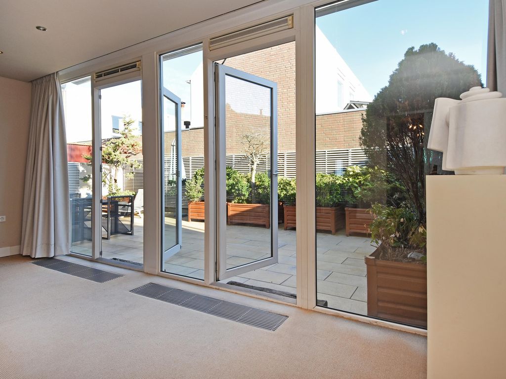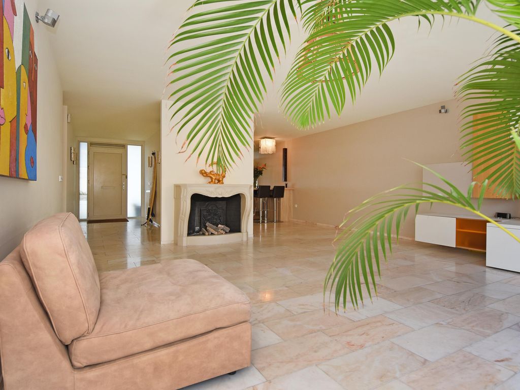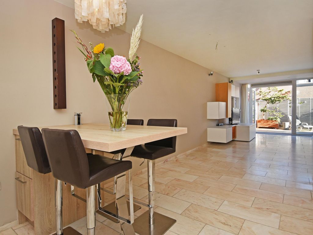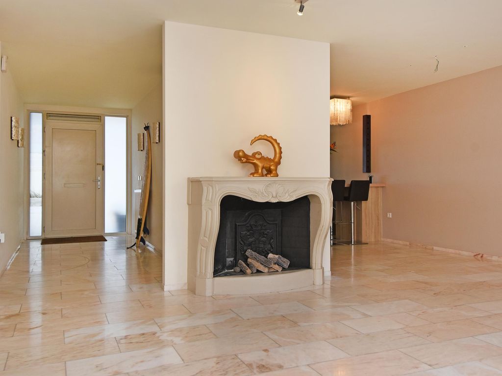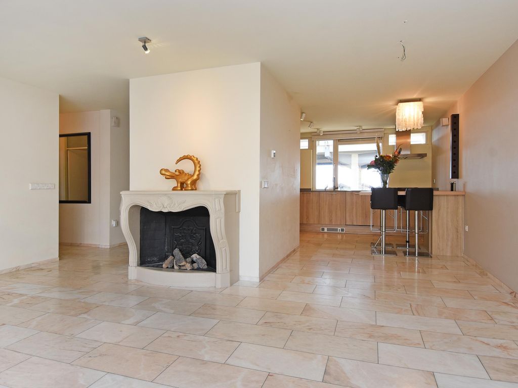 From the central hall, you enter the living room at the rear. The living room is spacious and very bright thanks to the large windows, without being overlooked. From the living room there is access to the sunny backyard through opening doors. Because the back garden spans the entire width of the house and the large windows, the living room feels particularly spacious. The living room also features a gel fireplace.