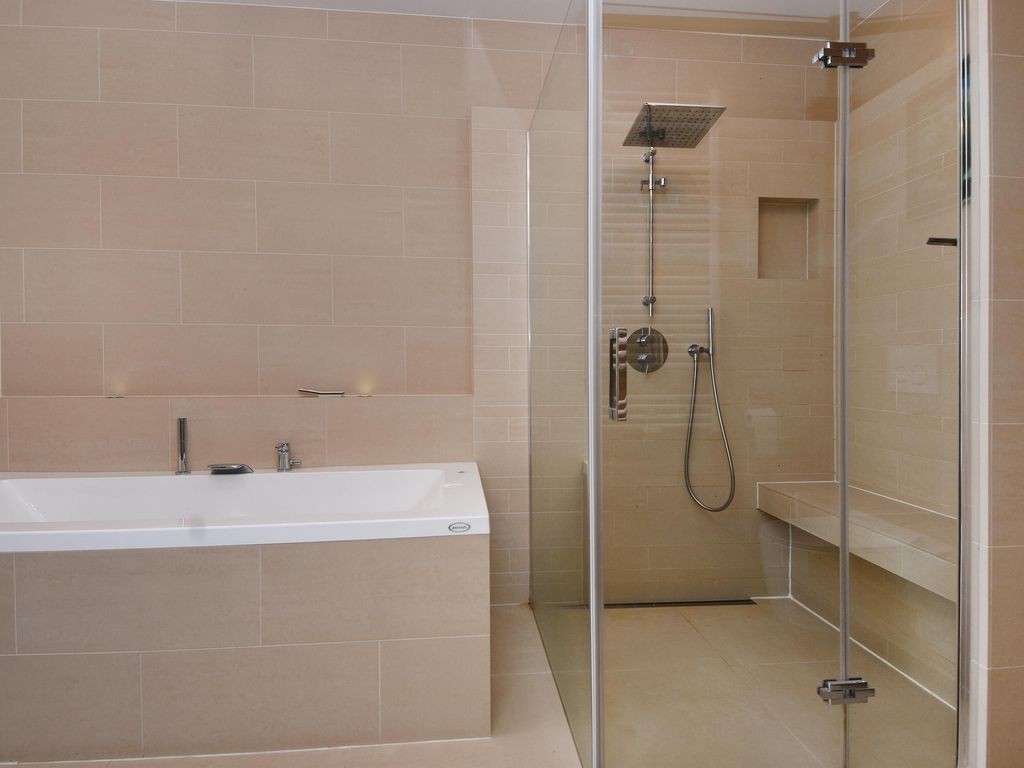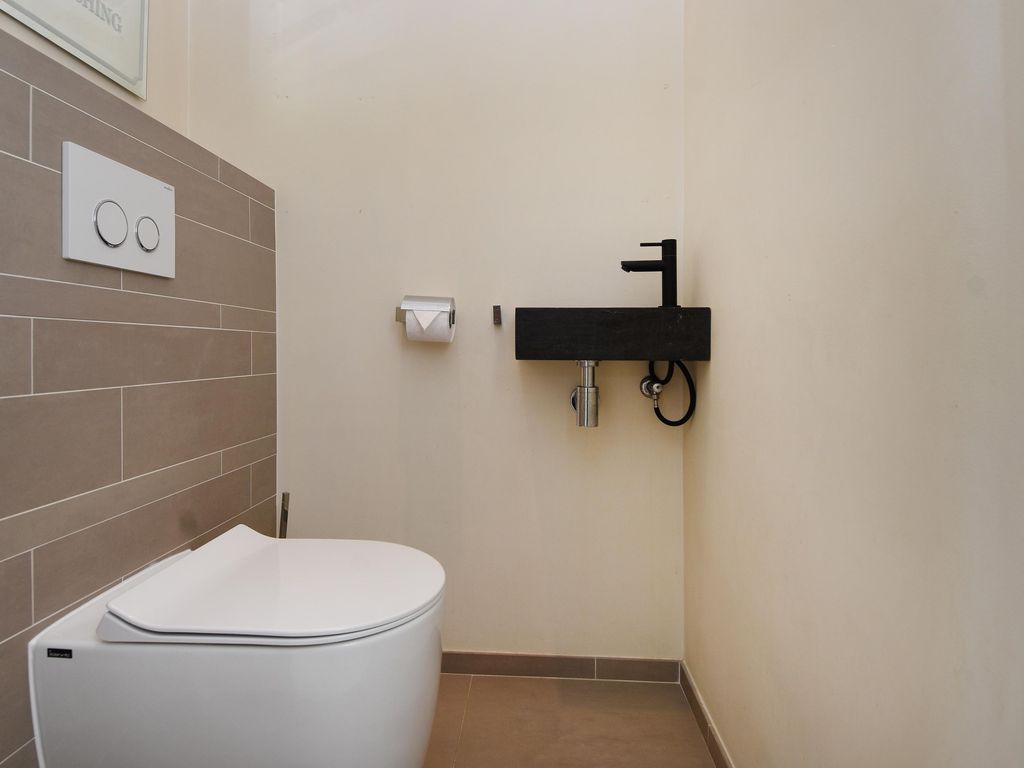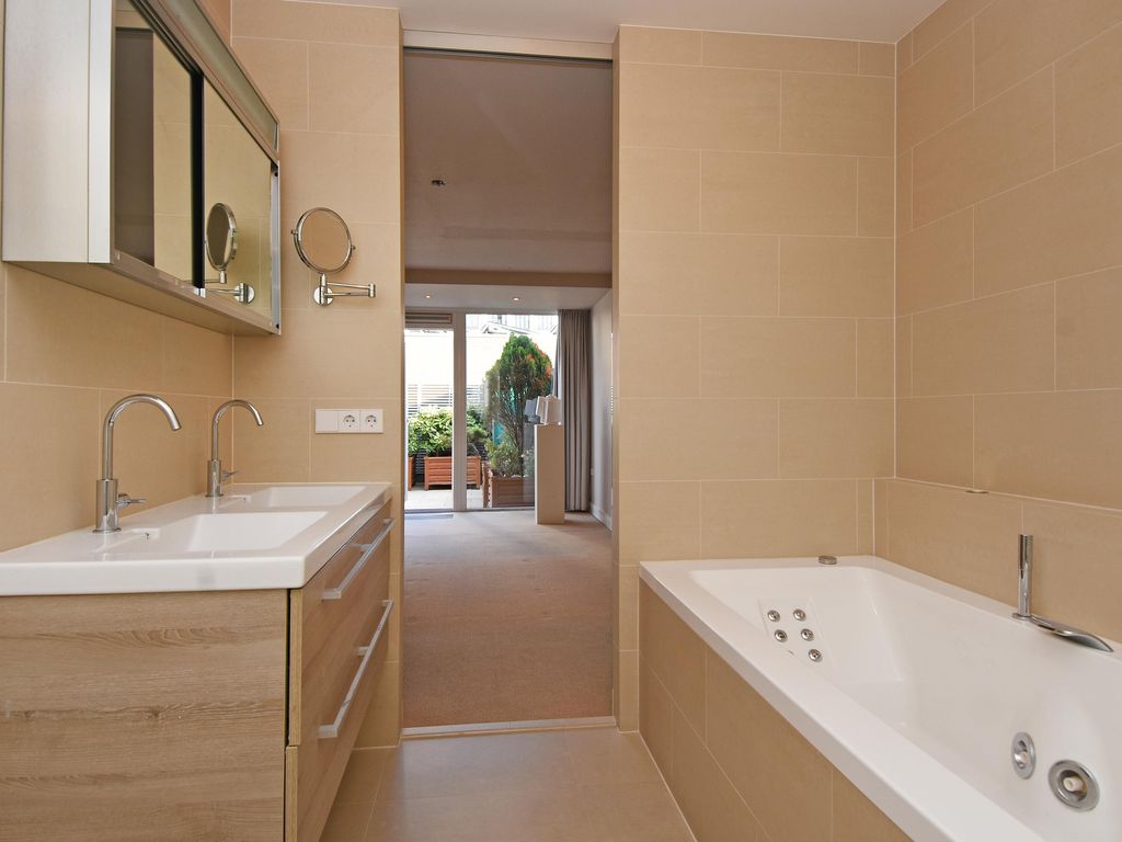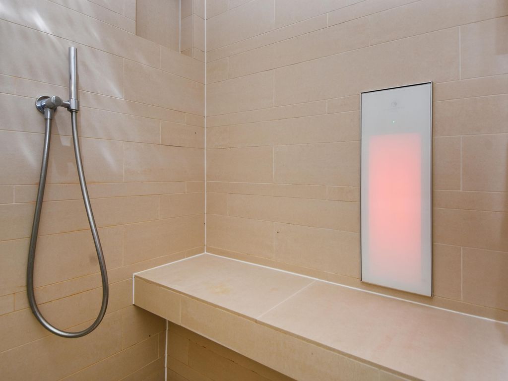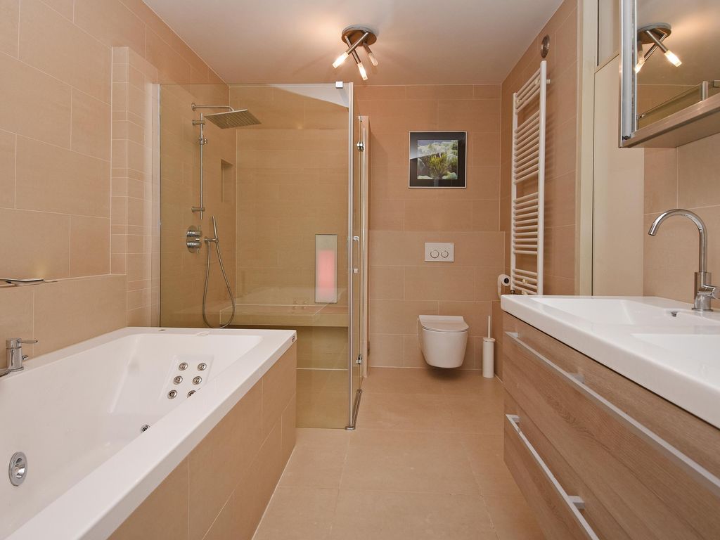 De modern uitgevoerde badkamer biedt een wellness aan huis en is voorzien van een Jacuzzi, een inloopdouche met zitje en infrarood douche, een hangend toilet en een dubbele wastafel met meubel en toiletkast met spiegels.