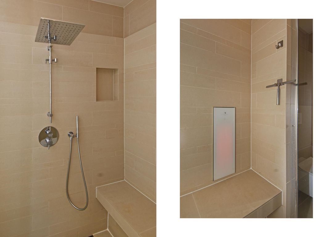The modern bathroom offers a home-like wellness experience, featuring a Jacuzzi, a walk-in shower with a seat and infrared shower, a wall-hung toilet, a double vanity with vanity, and a vanity with mirrors. Much of the apartment, including the kitchen and living room, also features beautiful natural stone flooring.