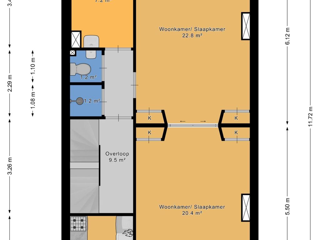 Aan de voorzijde is een balkon welke uitzicht geeft op het plantsoen. De keuken is via de voorkamer te bereiken. Aan de achterzijde is een slaapkamer met wastafel. In de hal zijn een douche en een separaat toilet met fonteintje.