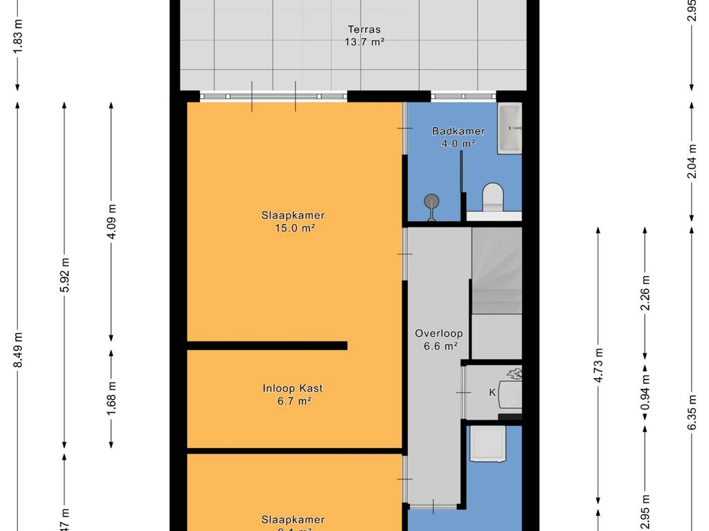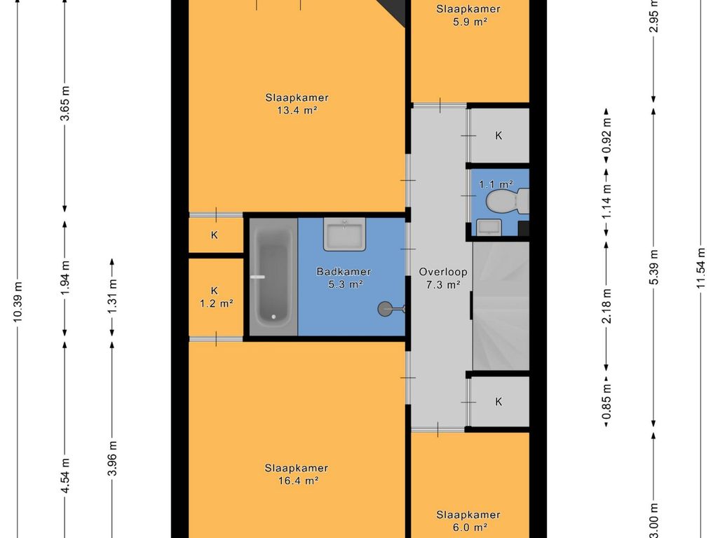 Ruime overloop met twee vaste kasten en separaat toilet met fonteintje. Royale slaapkamer aan de voorzijde met grote inbouwkast, een tweede slaapkamer met balkon aan de achterzijde en een derde (zij)kamer. Moderne tussenbadkamer voorzien van ligbad, inloopdouche en wastafelmeubel.