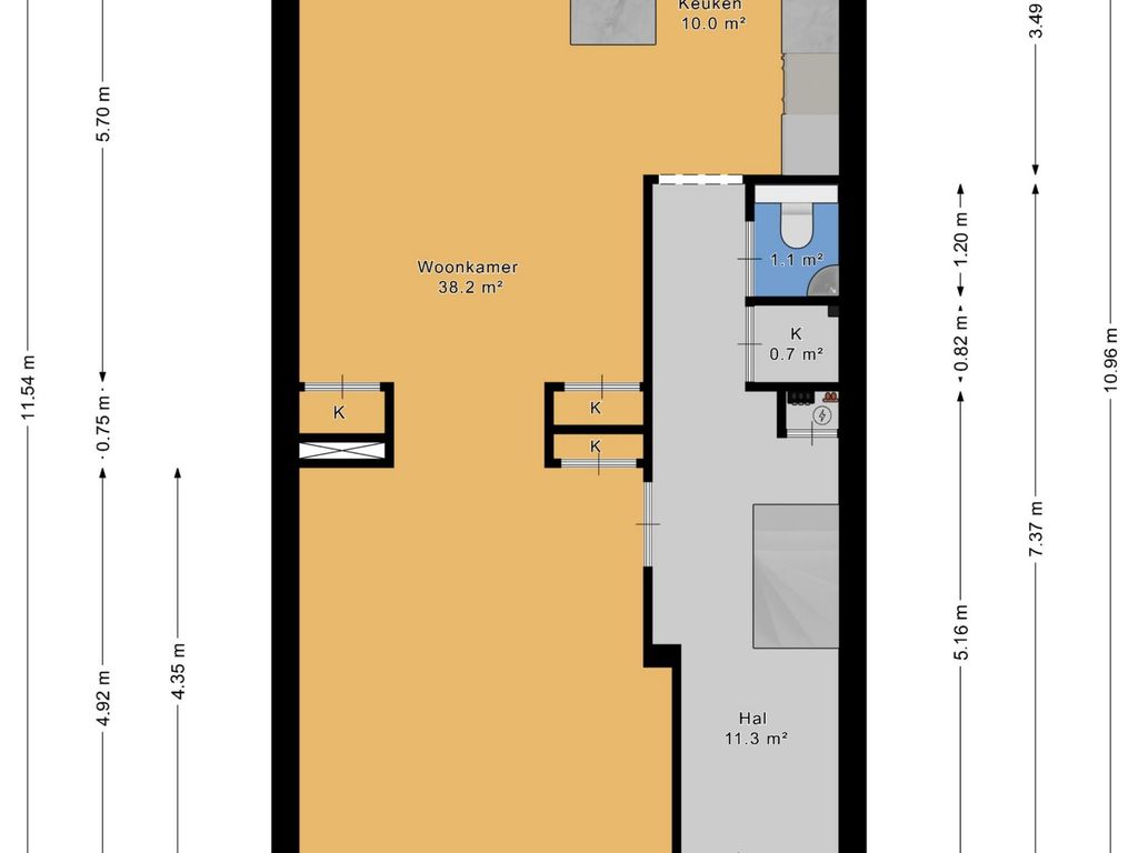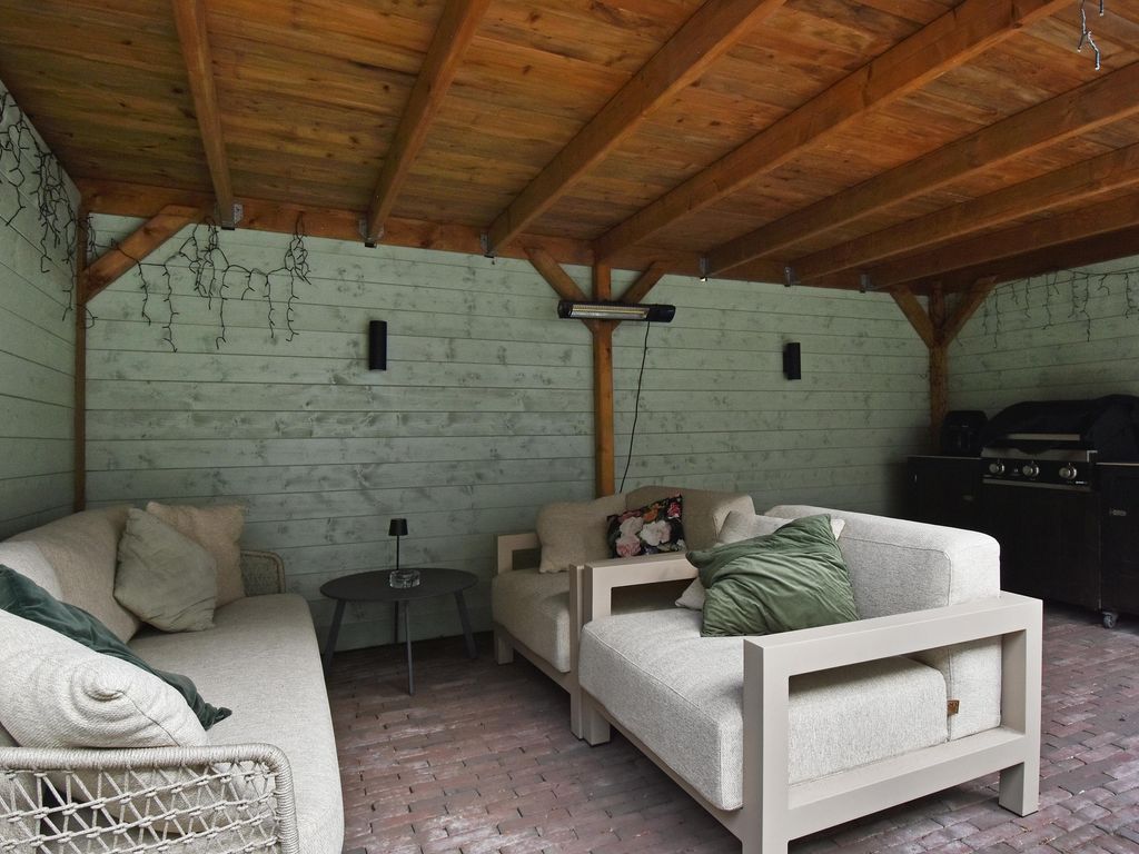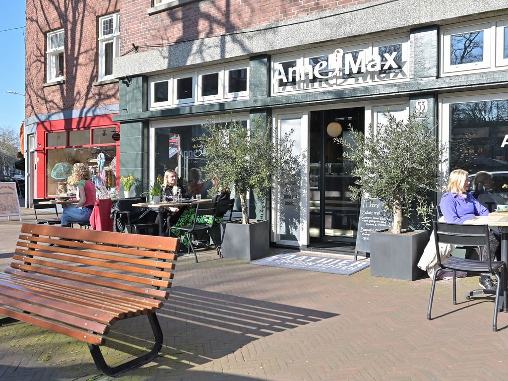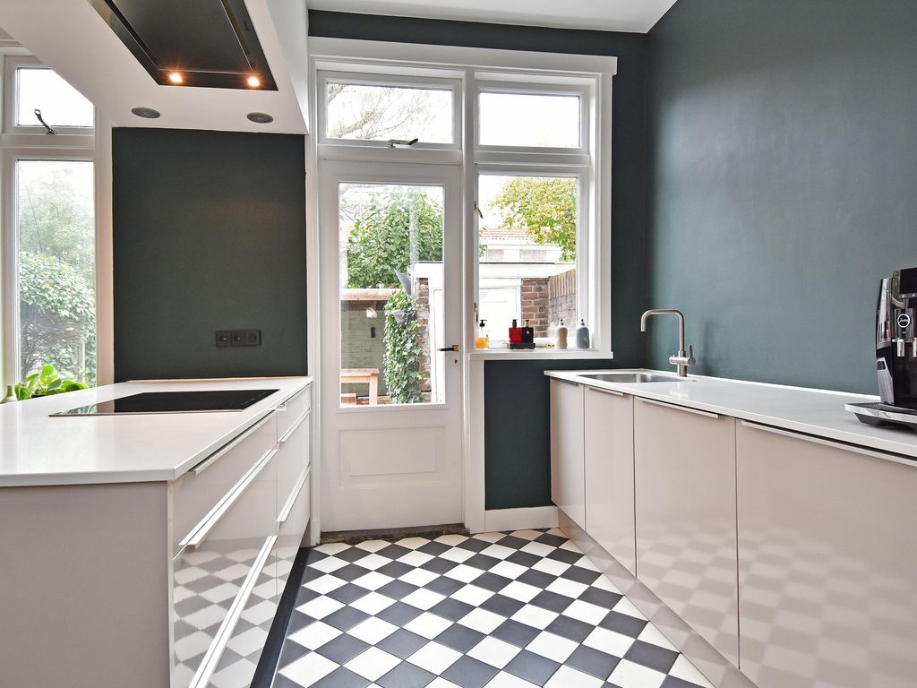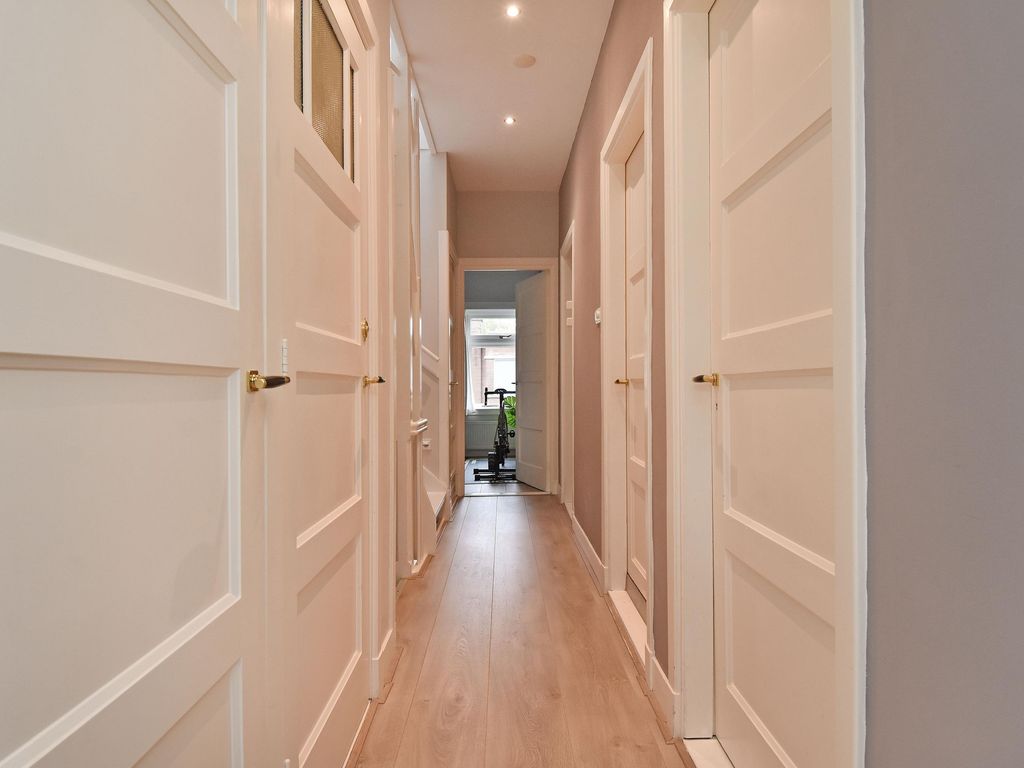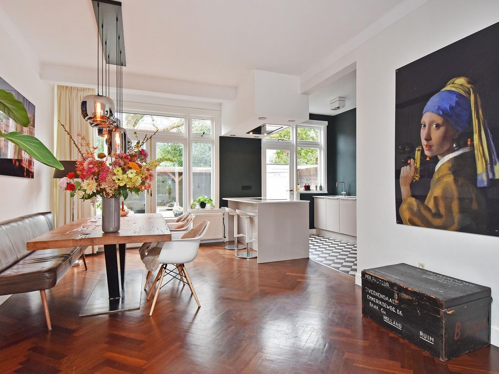 Representatieve entree met garderobe en gang voorzien van vaste kast, trapkast en modern toilet met fonteintje. Ruime en lichte woonkamer aan de voorzijde met fraaie vloerafwerking en suite-separatie met ingebouwde kasten. Aan de achterzijde bevindt zich de eetkamer met moderne open keuken, uitgerust met diverse inbouwapparatuur en een centraal kookeiland. Via openslaande deuren toegang tot de zonnige achtertuin met veranda – een heerlijke plek om buiten te genieten.