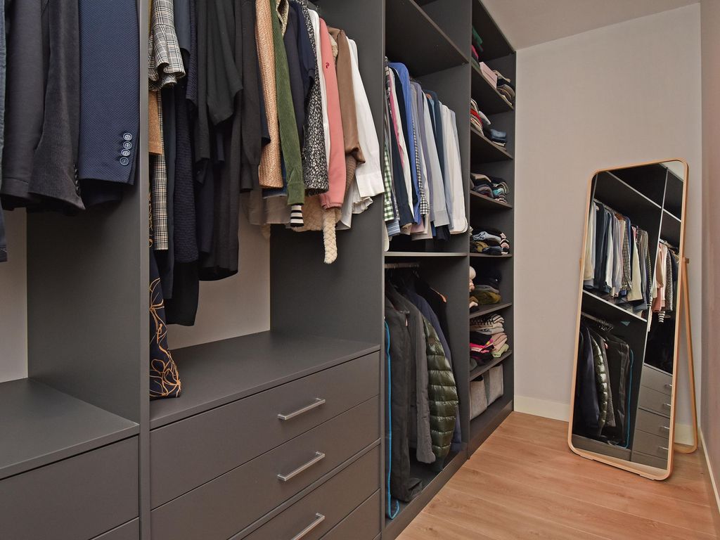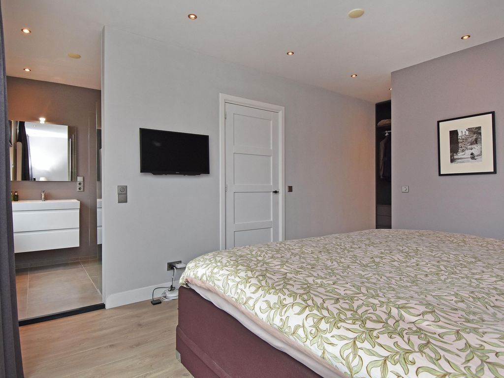 Overloop, ruime slaapkamer aan de achterzijde met aangrenzende inloopgarderobe en moderne badkamer met douche, wastafelmeubel en toilet. Toegang tot het brede dakterras met vrij uitzicht. Aan de voorzijde bevindt zich nog een slaapkamer en een aparte wasruimte.