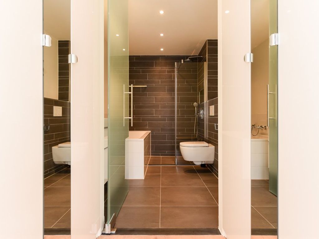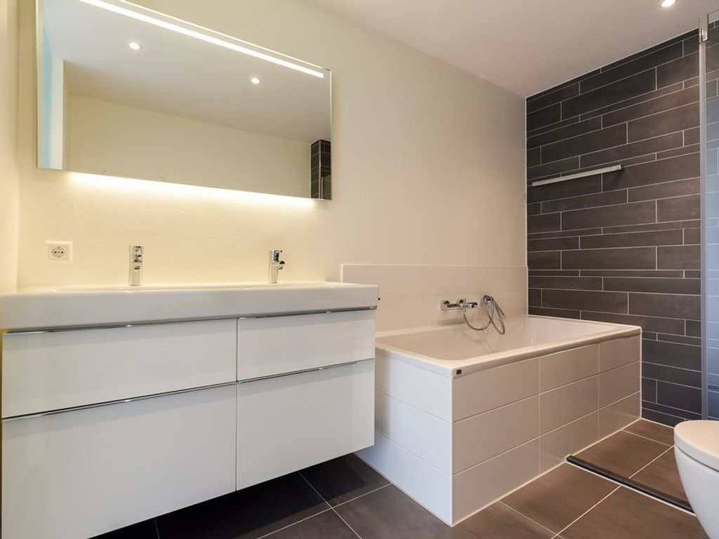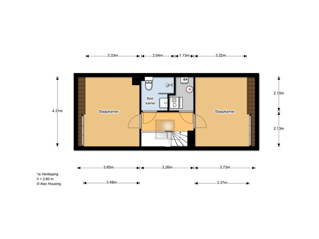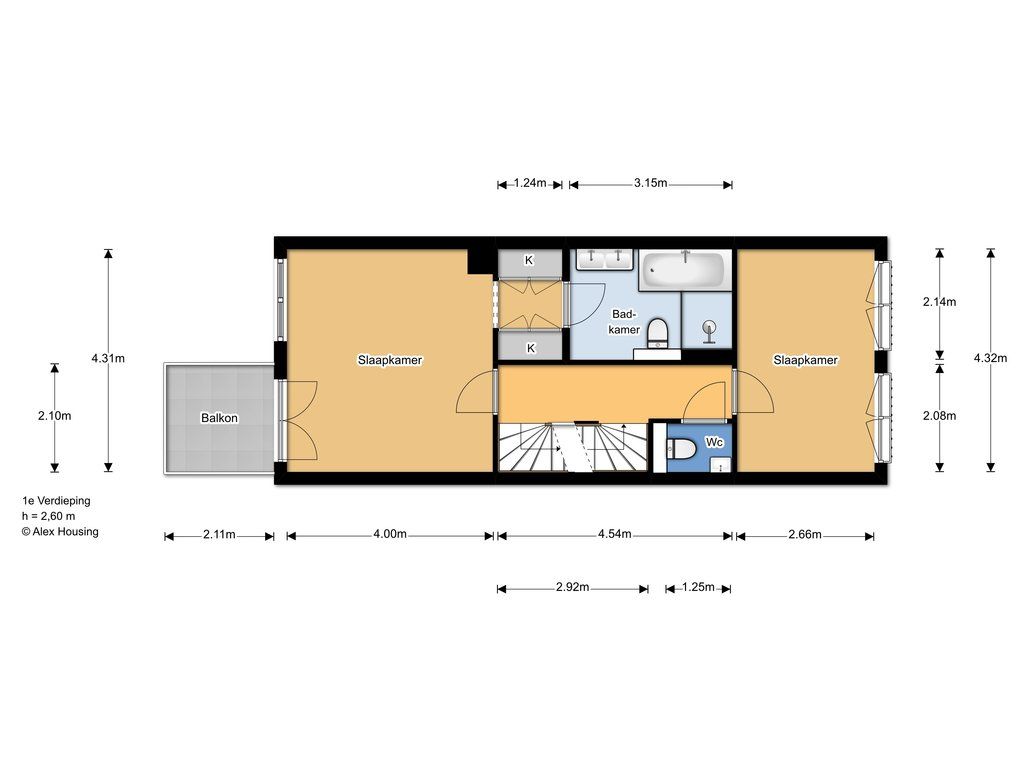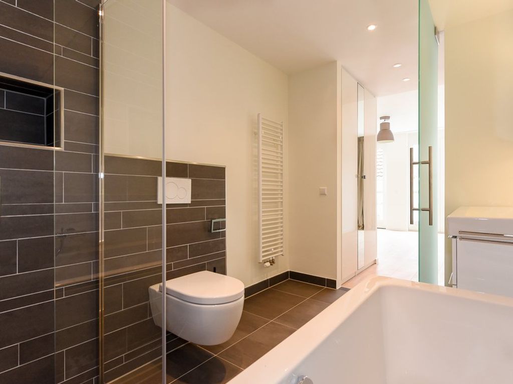 1st floor: toilet, back bedroom (4.31 x 4.00) with built-in cupboards, bedroom at the front (4.32x 2.66) with dressing area and connected bathroom with bath, double washbasin, shower and toilet, large bathroom (3.15x2.14), separate toilet in the hallway, stairs to the 2nd floor;
