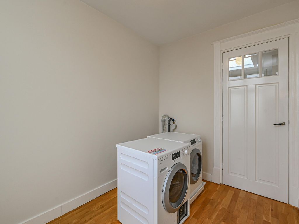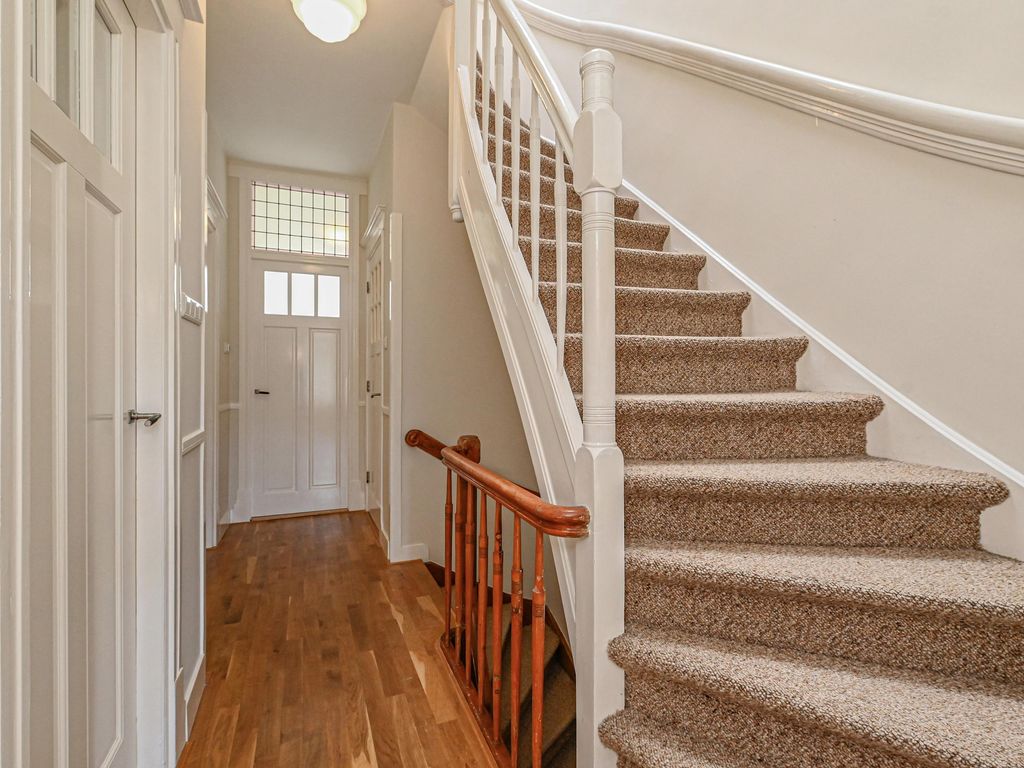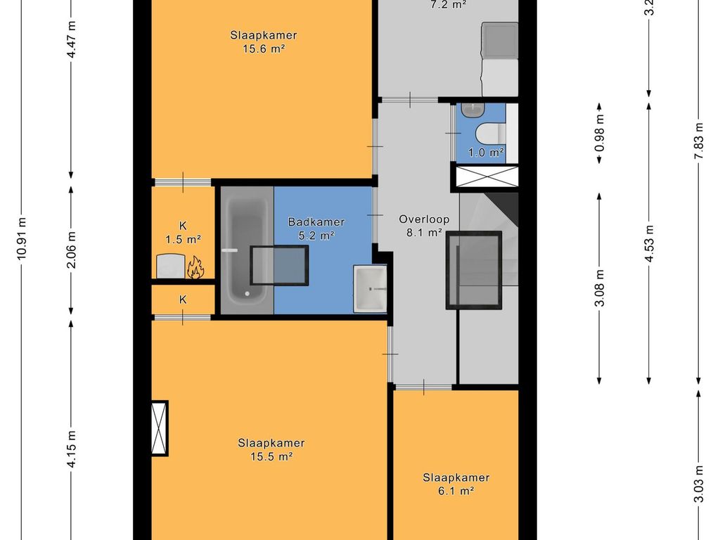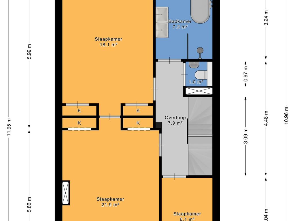 2e verdieping; overloop, modern toilet, kleine achterzijkamer met opstelling wasmachine en droger. Grote achterzijkamer met inloopkast en CV-combiketel, grote voorslaapkamer met balkon en een kleine voorzijkamer.