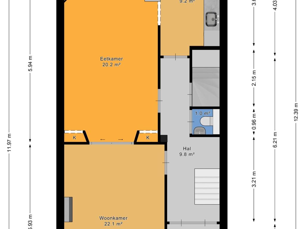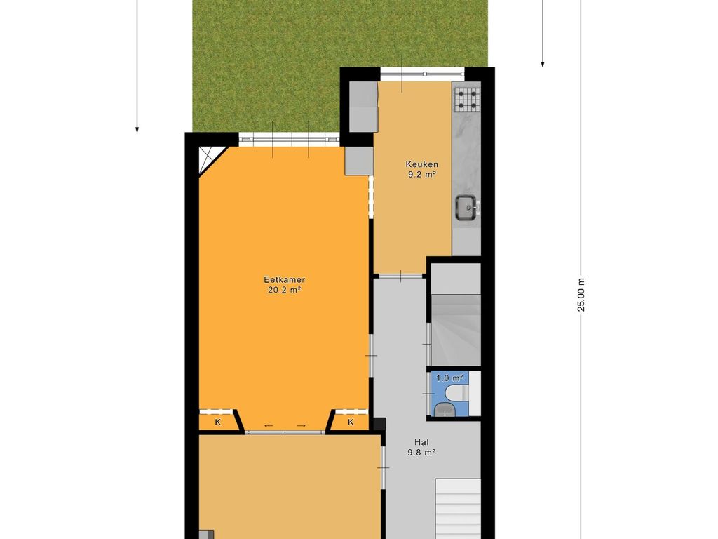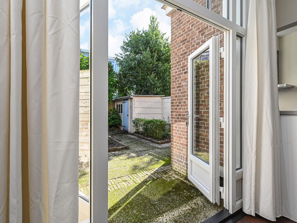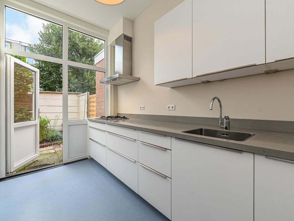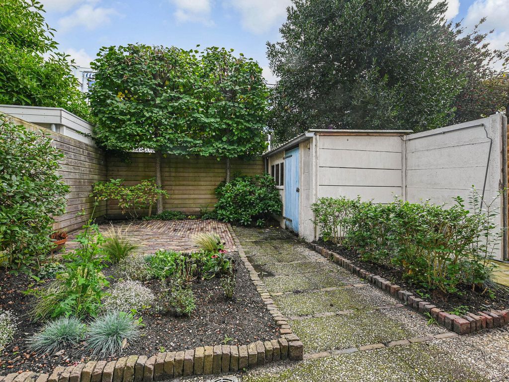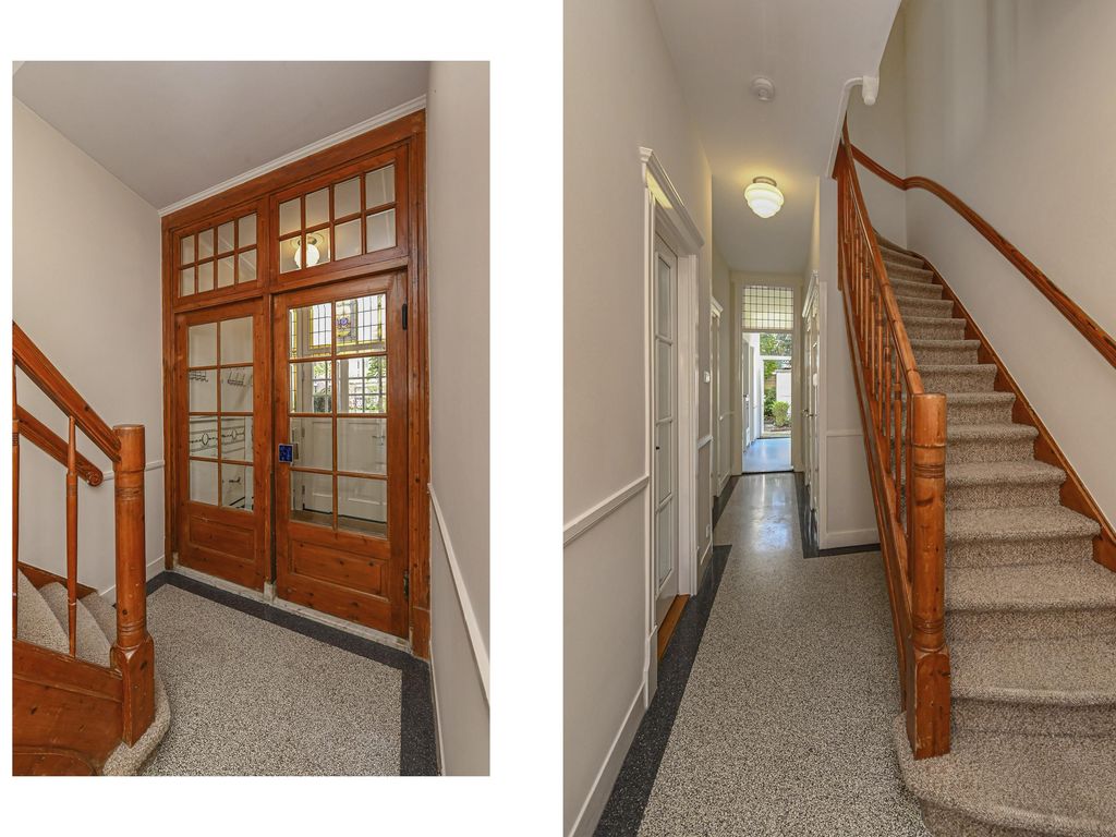 Begane grond; entree, vestibule met originele wandtegels en granito vloer, meterkast, gang met granito vloer, open ruimte onder de trap, net toilet, toegang tot de kelder onder de keuken. Grote woon/eetkamer ensuite met aan de voorzijde een open haard en voorzien van parket. Aan de achterzijde zijn openslaande deuren naar de achter tuin en een doorbraak naar een moderne keuken met inbouw apparatuur. In de achtertuin bevindt zich een berging.