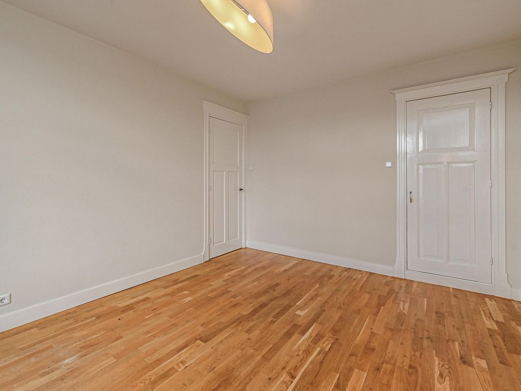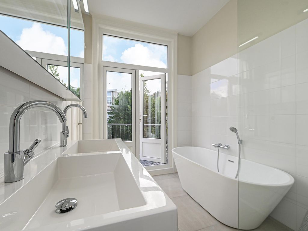 1e verdieping; overloop, modern toilet, nette achterzij badkamer met twee wastafels, douche, ligbad en deur naar balkon, ruime achterslaapkamer met schuifdeuren ensuite met 2 vaste kasten naar een ruime voorkamer met erker, kleine voorzijkamer. De gehele 1e verdieping is van lamellen parket voorzien met uitzondering van het toilet en de badkamer.