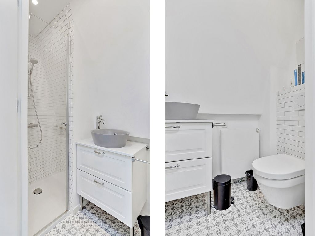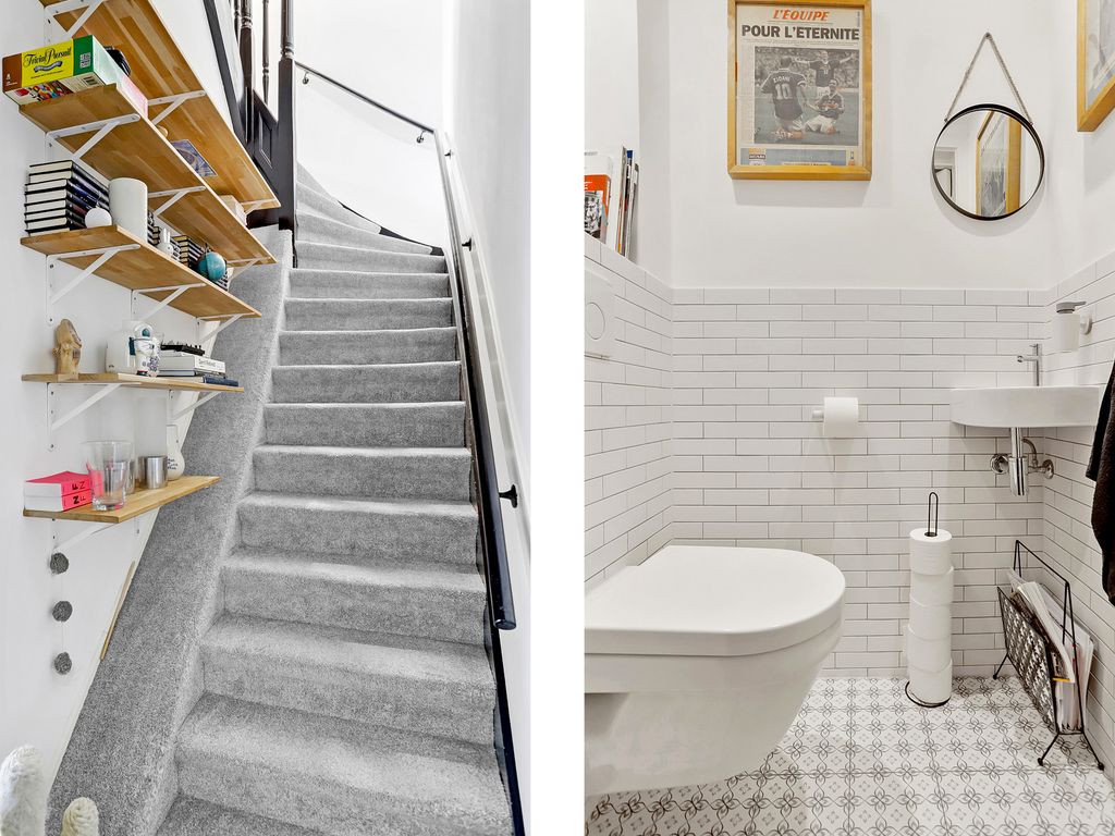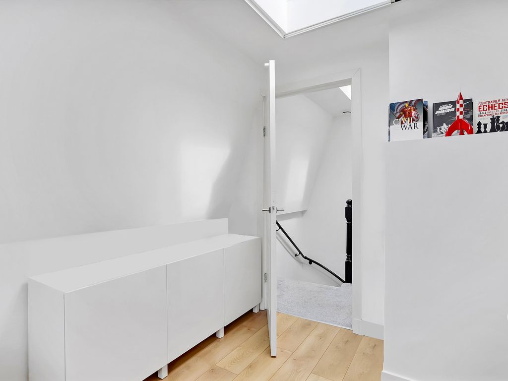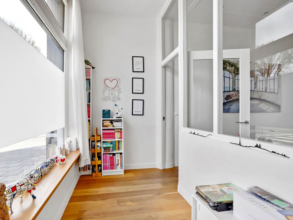 At the rear: a large bedroom with wardrobes and French doors to the garden, a modern guest toilet and a luxurious bathroom with bathtub, walk-in shower, double washbasin and laundry connections. A side hall leads to the extension with three additional bedrooms spread over three levels, one with a private bathroom.