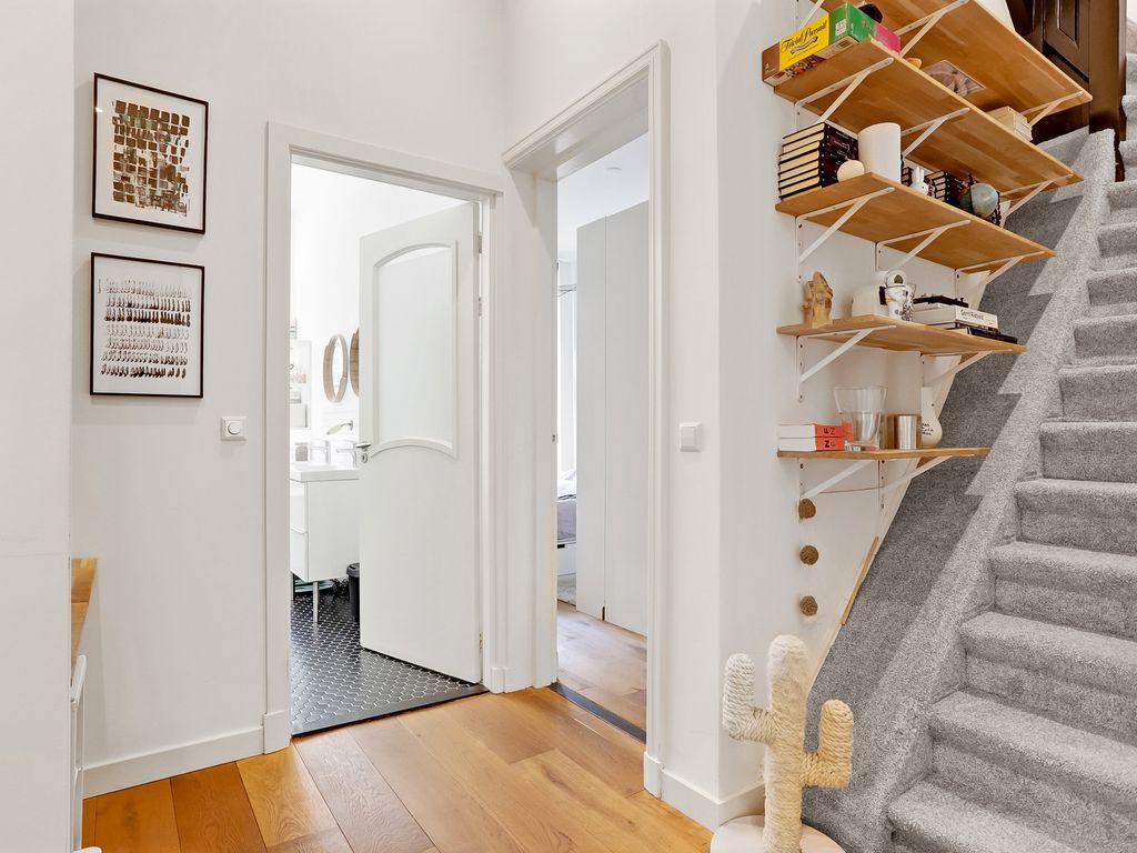Entree met garderobe en bergruimte. Ruime, lichte woonkamer met eiken vloerdelen, vloerverwarming en moderne open keuken met inbouwapparatuur. Via openslaande deuren toegang tot de zonnige achtertuin (west).
