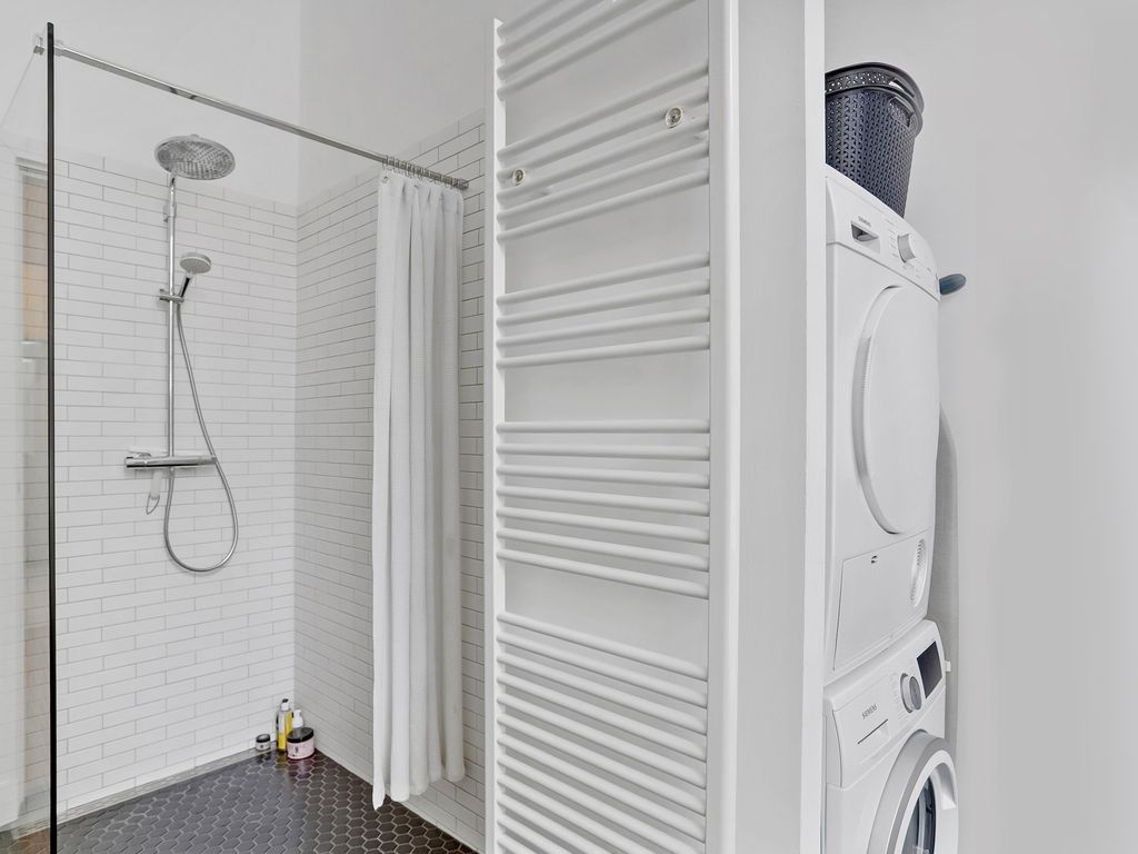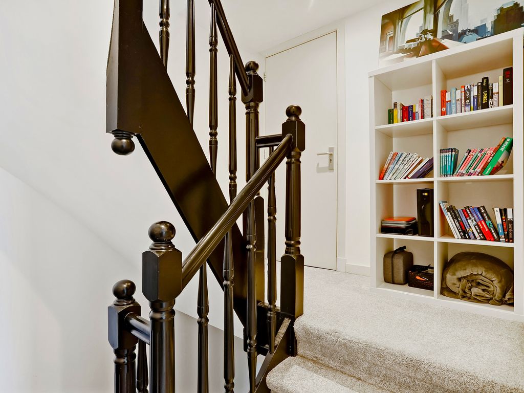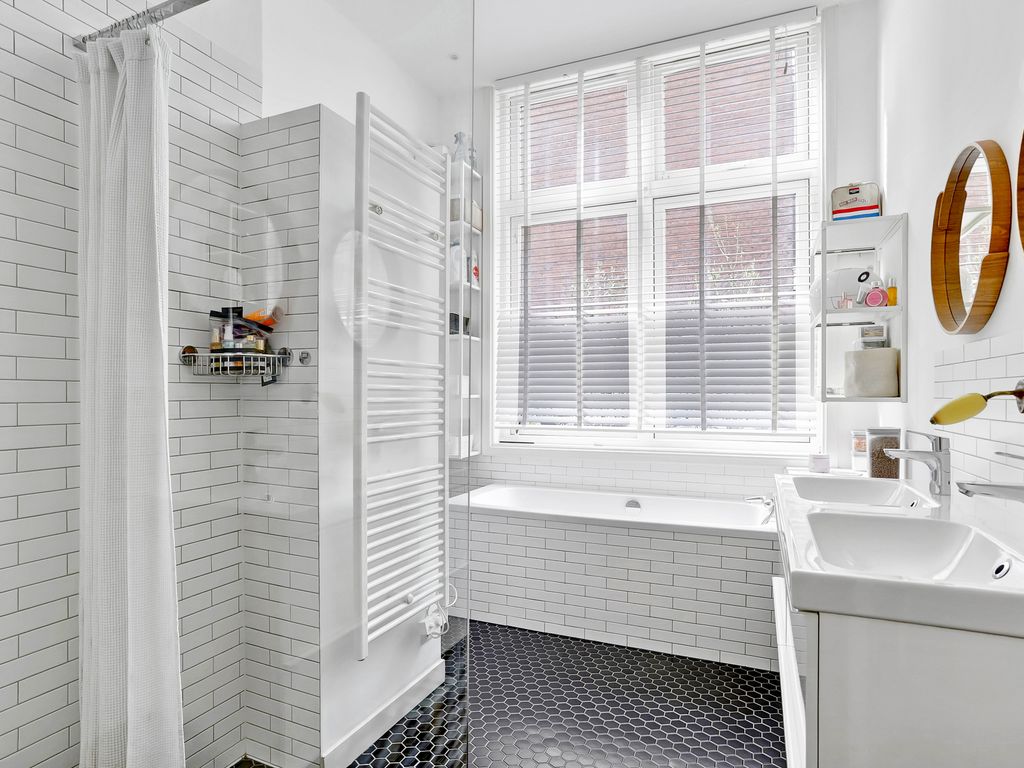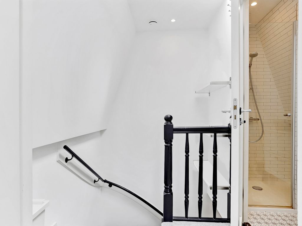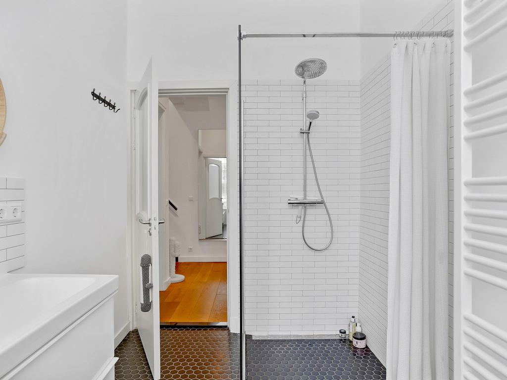 Aan de achterzijde een ruime slaapkamer met kastenwand en openslaande deuren naar de tuin, een modern toilet en een luxe badkamer met ligbad, inloopdouche, dubbele wastafel en aansluiting voor wasmachine/droger. Vanuit de hal toegang tot de achterbouw met drie slaapkamers verdeeld over drie verdiepingen, waarvan één met eigen badkamer.