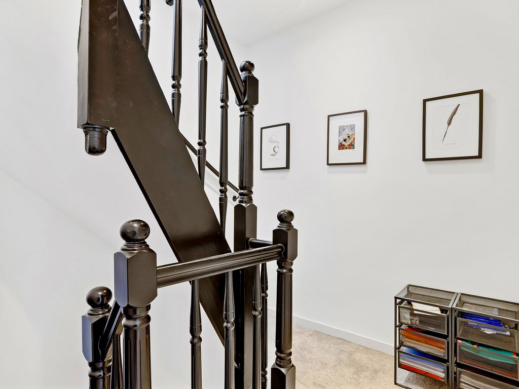 Spacious entrance with storage. Bright living/dining room with oak flooring, underfloor heating and a modern open-plan kitchen with built-in appliances. French doors open onto the well-maintained west-facing garden.