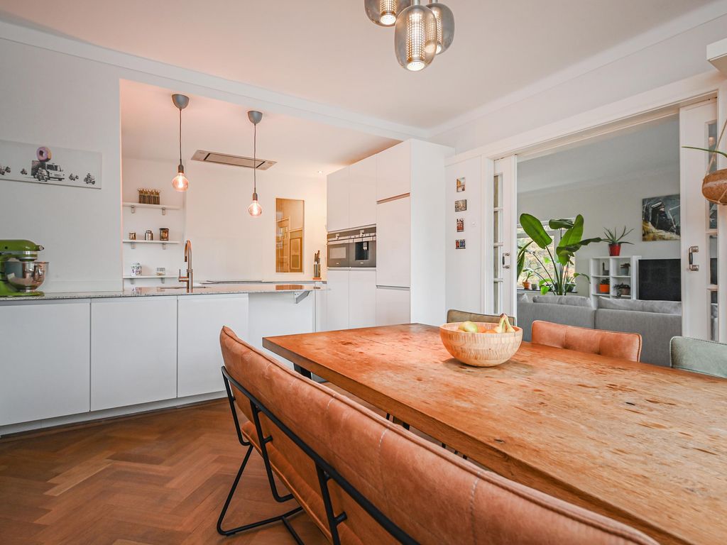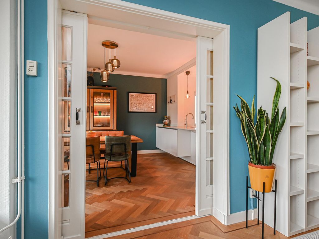 Het appartement van ca. 97 m2 is gebouwd in 1937 en is een unieke woning door de locatie en de charmante elementen die bewaard zijn gebleven zoals de originele ensuite schuifdeuren, de visgraatvloer en het prachtige glas-in-lood in de paneeldeuren. De woning heeft aan de voorzijde een heerlijk lichte en ruime woonkamer met een groot, zonnig balkon gelegen op het noordwesten met heerlijke namiddag en avondzon. Middels de ensuite deuren toegang tot de eetkamer met moderne open keuken inclusief diverse inbouwapparatuur (waaronder een ijskast afwasmachine, (stoom)oven, koffiezetapparaat, 4 pits inductiekookplaat en afzuigkap), een tweede balkon gelegen op het noordoosten, drie slaapkamers en stijlvolle badkamer met decostuc wanden en voorzien van Artweger douchebad, design wastafelmeubel en wc. Op de vierde etage bevindt zich nog een ruime lichte zolderberging (ca. 11 m2) met wasmachine- en drogeraansluiting en CV-ketel. En extra berging (ca. 5 m2) op de begane grond.