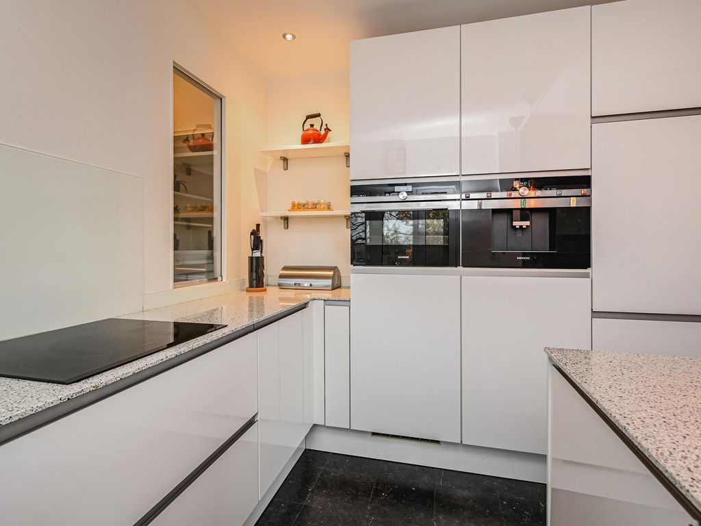 At the front, the apartment features a bright and spacious living room with a large, sunny balcony facing northwest, perfect for enjoying the afternoon and evening sun. Through the ensuite doors, you enter the dining room with a modern open kitchen, fully equipped with built-in appliances including a refrigerator and freezer, dishwasher, (steam) oven, coffee machine, four-burner induction hob, and extractor hood.