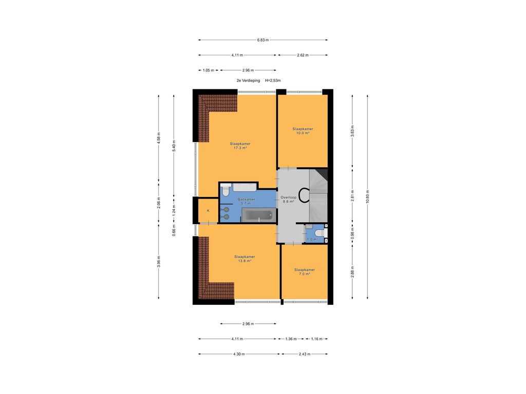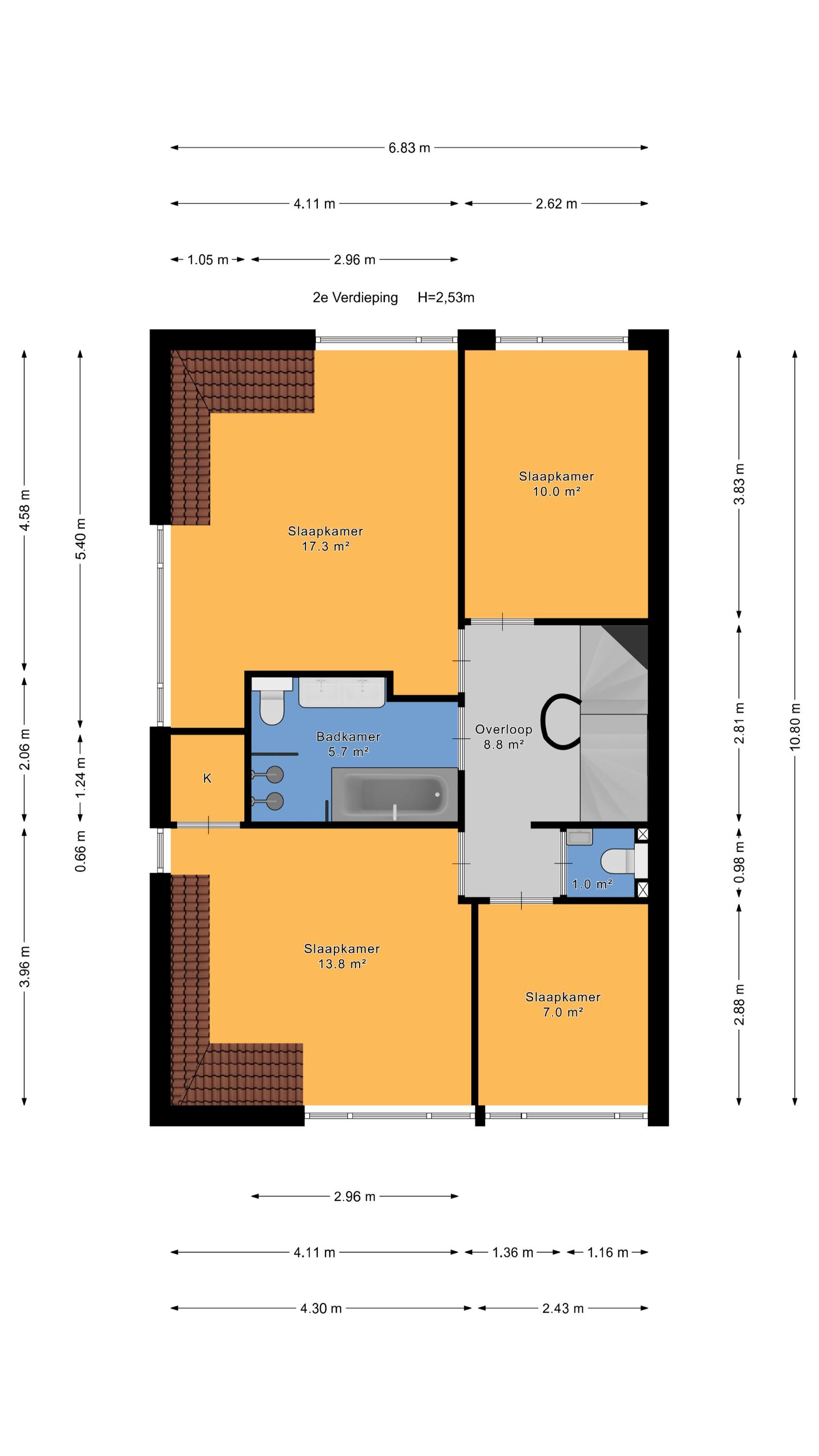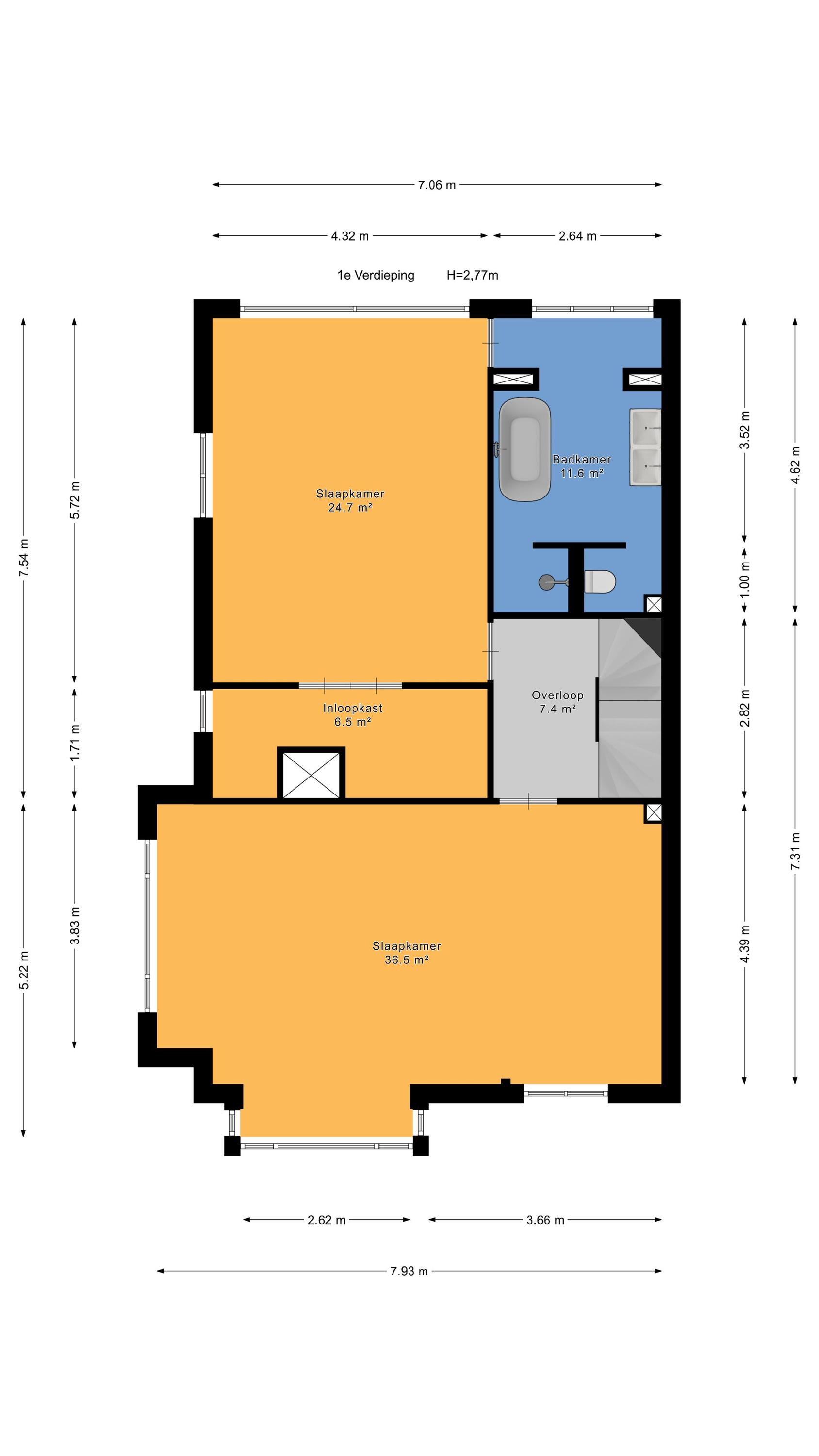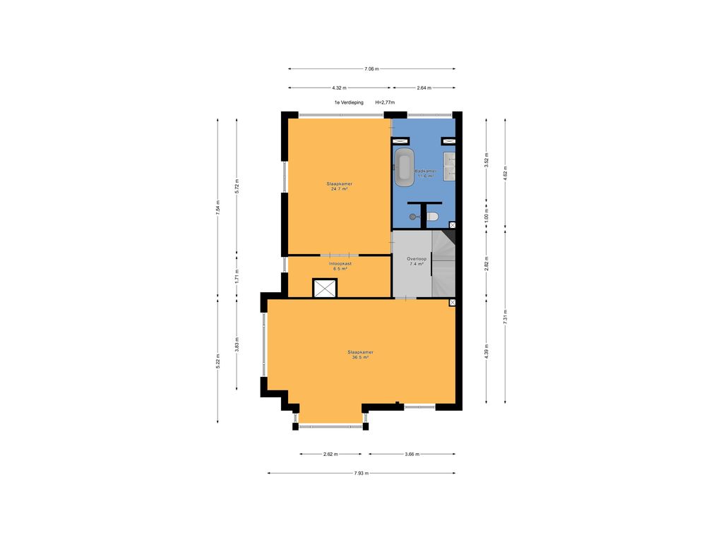Overloop, ruime lichte family room/studeerkamer aan de voorzijde, grote ouderslaapkamer met grote inloopkast, badkamer met inloop douche, ligbad en wc.