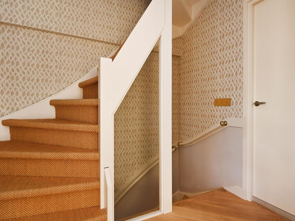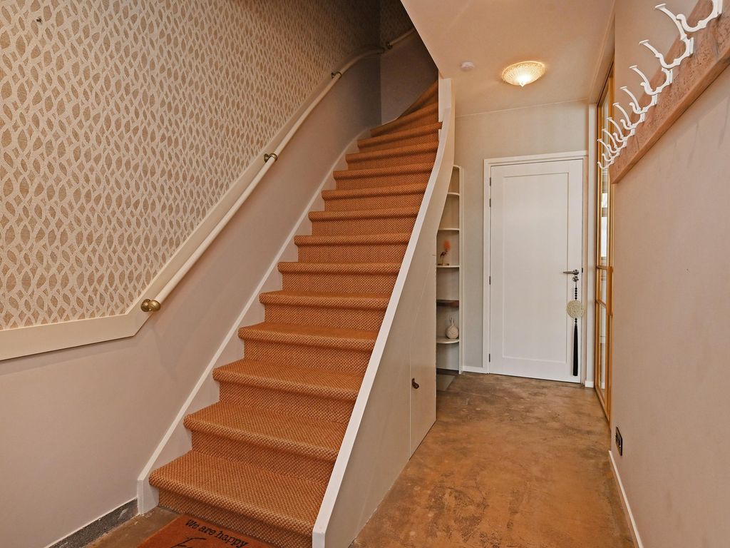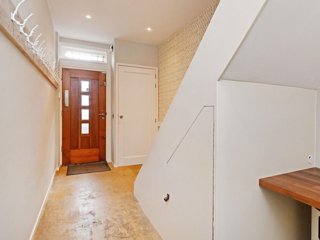 Ruime entree met hal, meterkast, garderobe en een modern toilet met fonteintje. Onder de trap naar de 1e verdieping is een prettige werkplek gecreëerd.