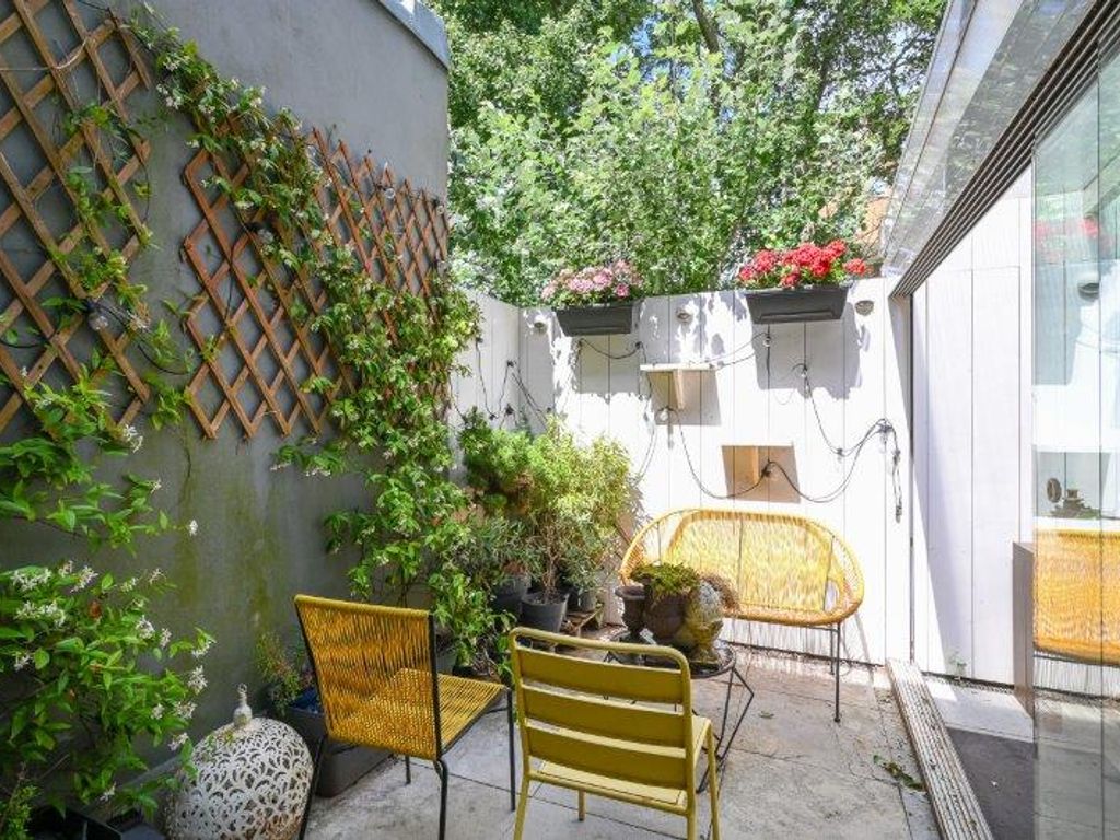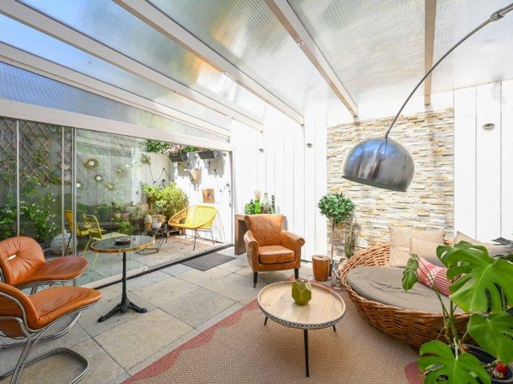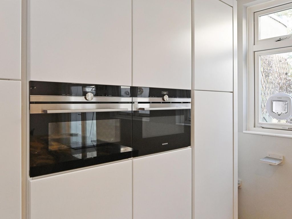 A beautiful steel door leads into the spacious, open-plan living and dining room with a stylish concrete floor and underfloor heating, and a luxurious open-plan kitchen with a cooking and sink island and integrated appliances. The living room provides access to the back garden. The back garden has been recently renovated and features a conservatory. A wonderful place to enjoy the morning and afternoon sun, and it serves as an extension of the living/dining room.