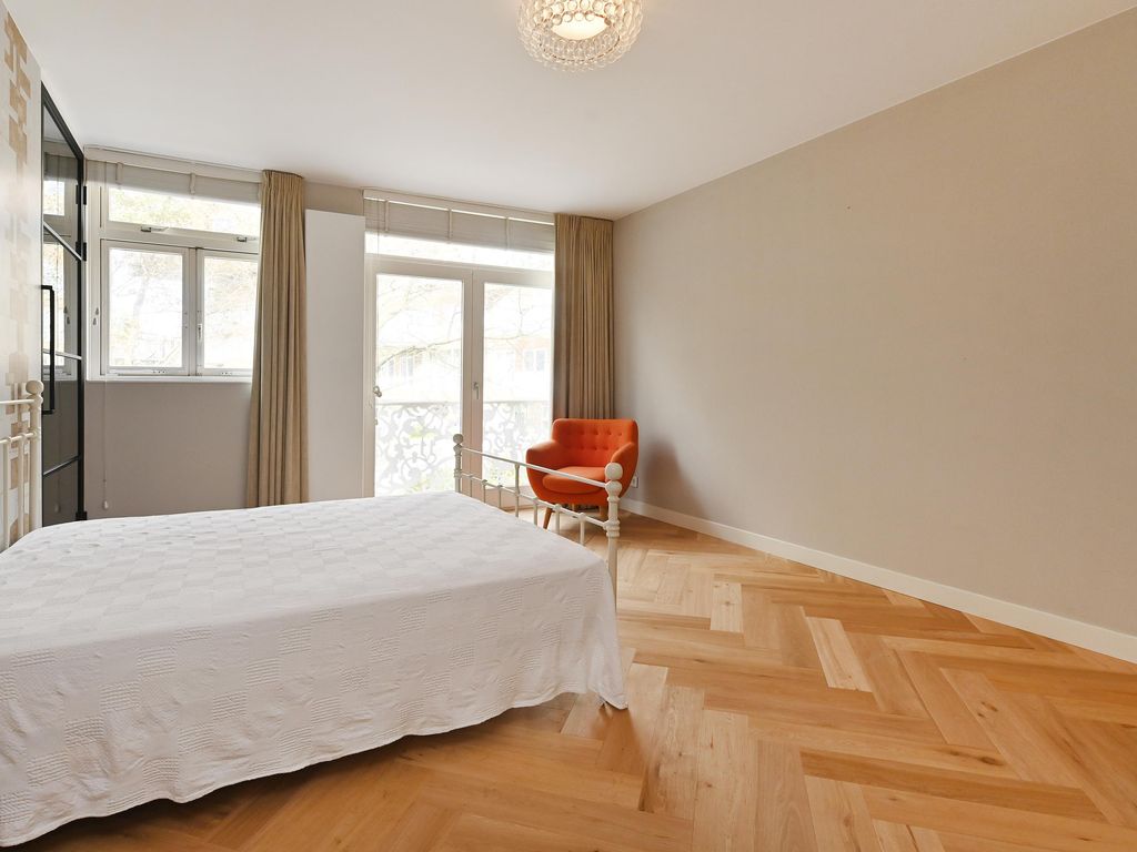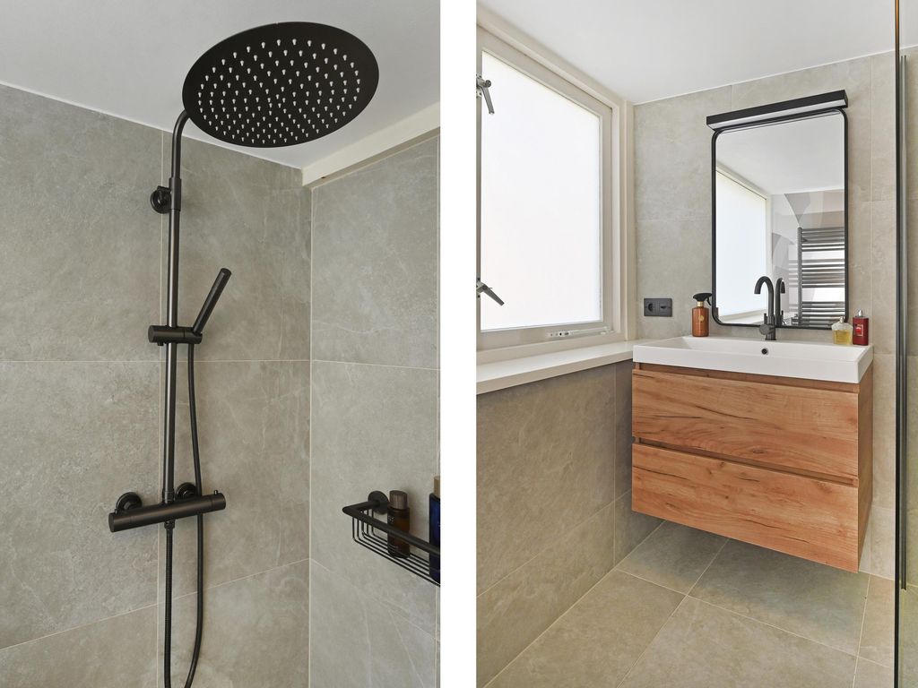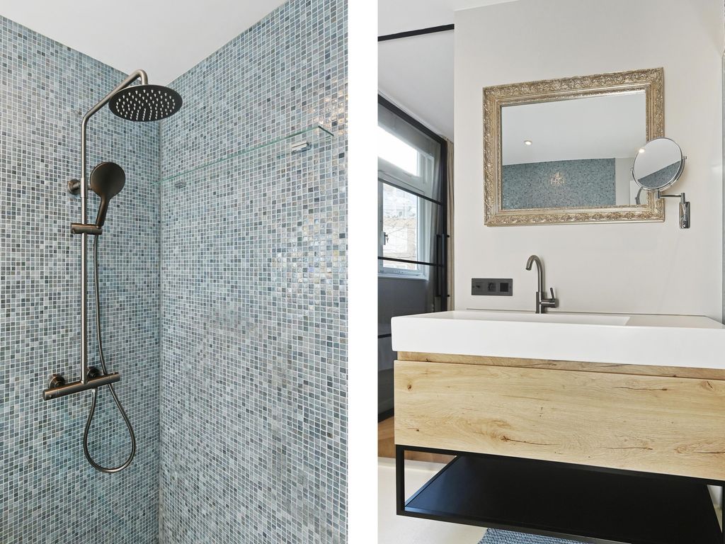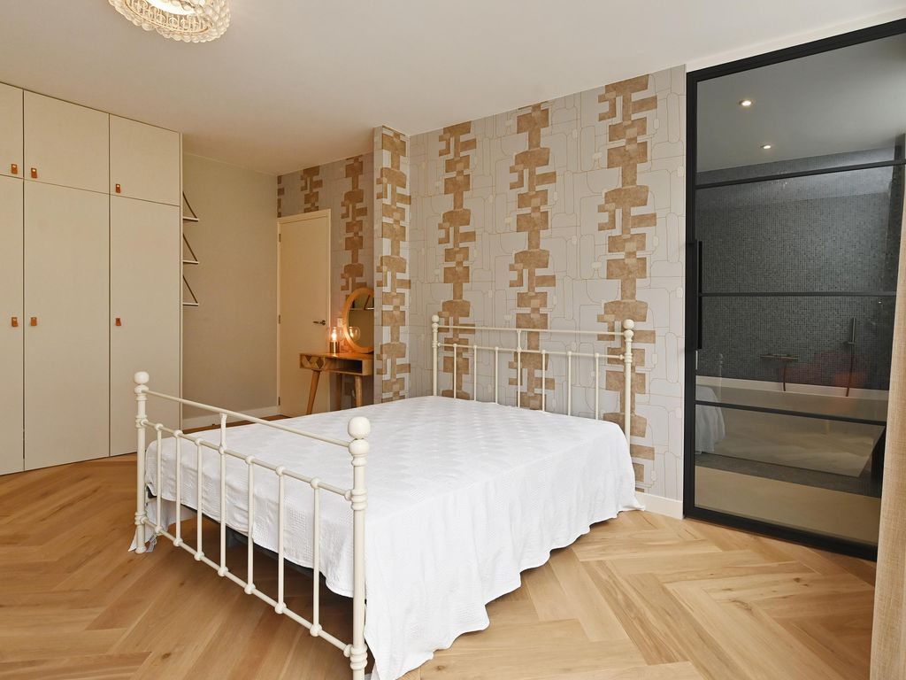 Ruime slaapkamer aan de achterzijde met Frans balkon en aangrenzende luxe afgewerkte badkamer met ligbad, inloopdouche, extra brede wastafel met meubel, modern hangend toilet en designradiator. Vanaf de overloop trap naar de 2e verdieping.