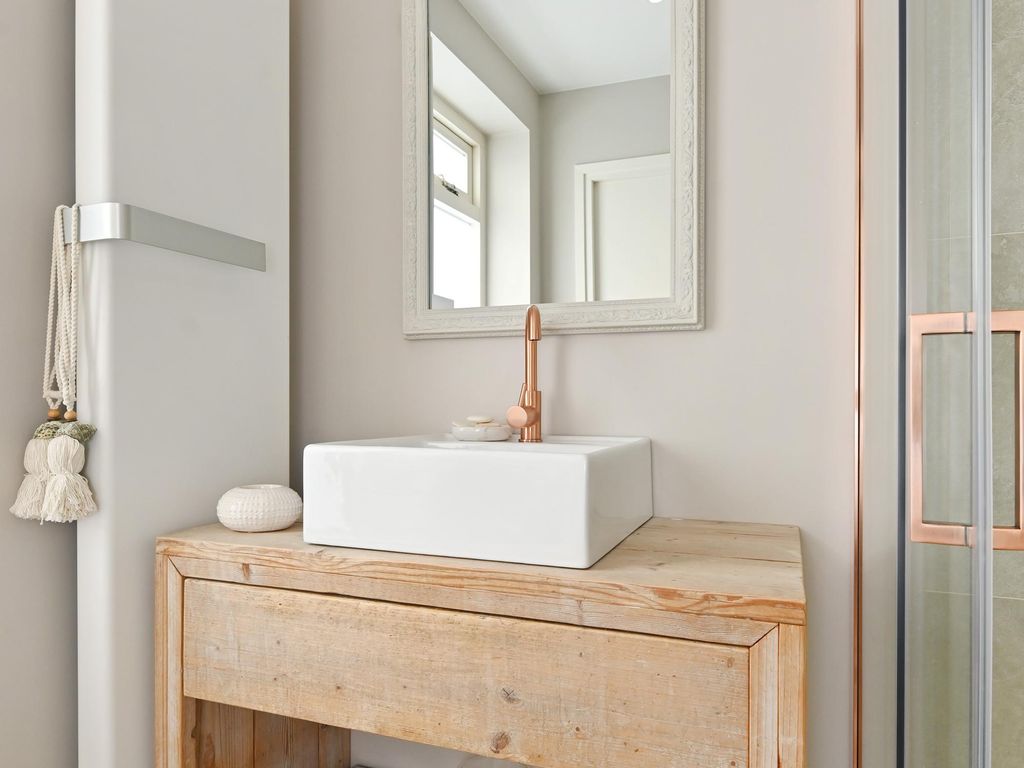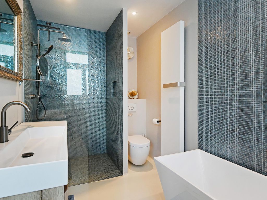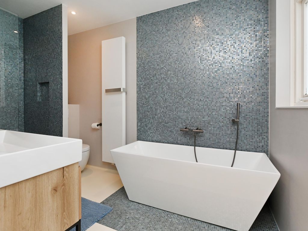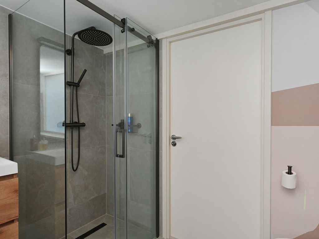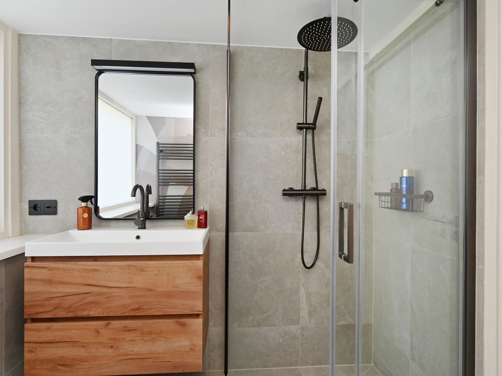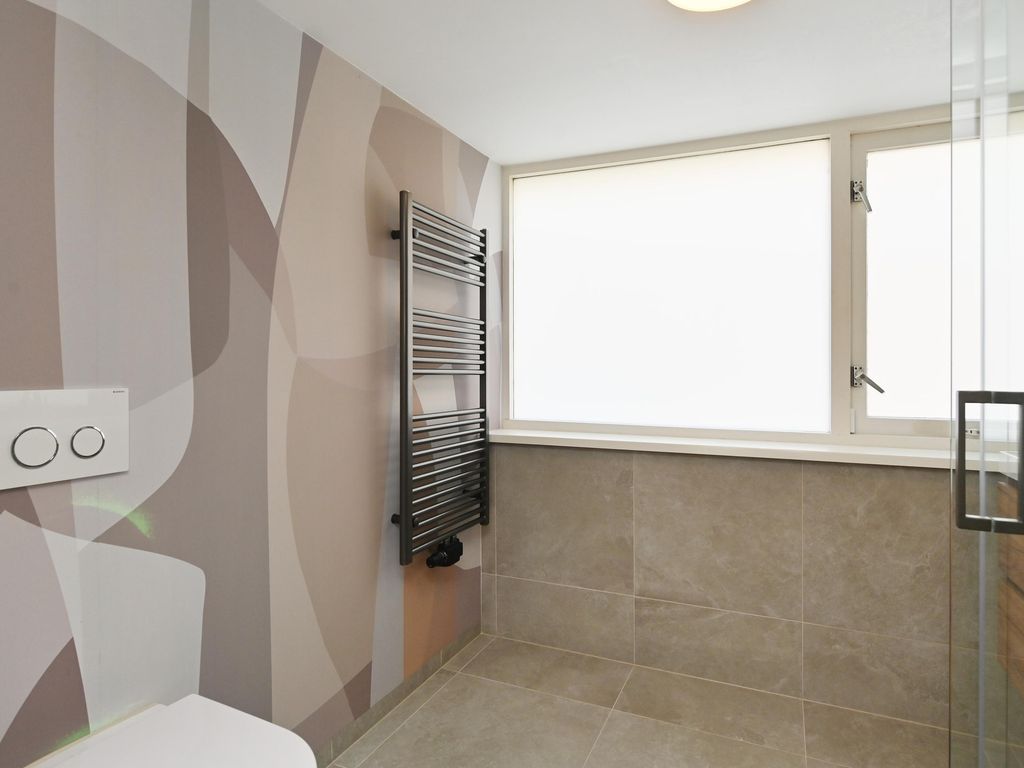 Ruime slaapkamer met eigen moderne badkamer voorzien van douche, wastafel, toilet en designradiator.