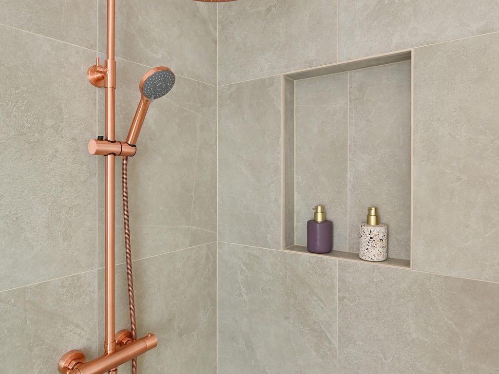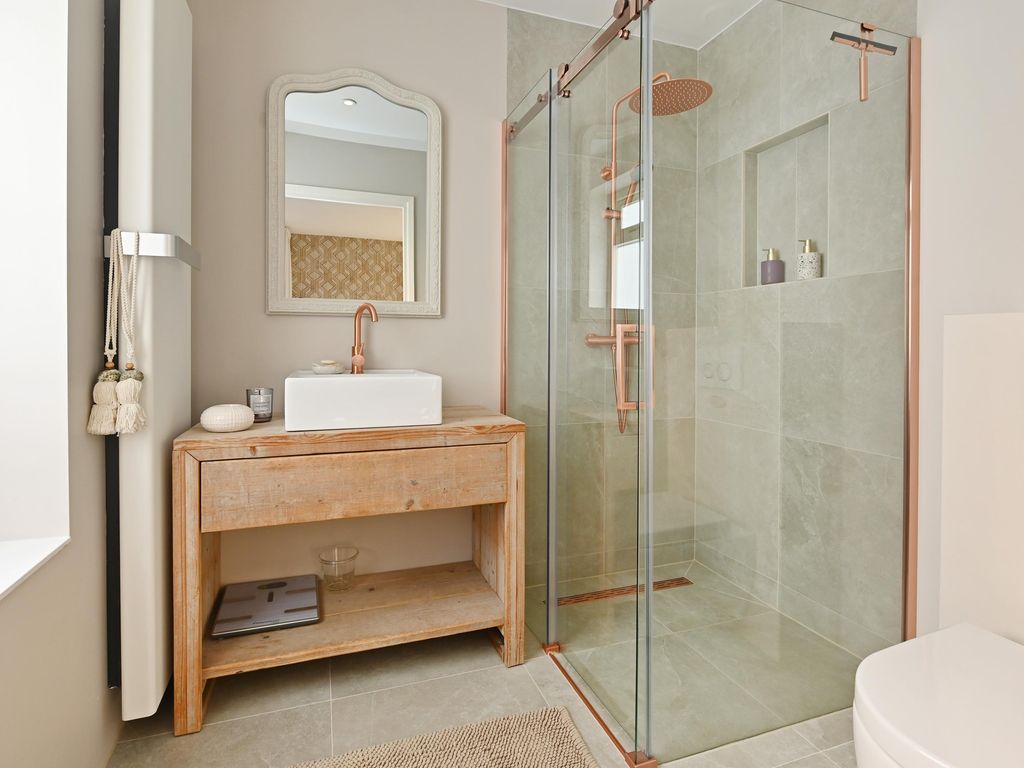 Spacious bedroom with en-suite modern bathroom featuring a shower, sink, toilet, and designer radiator.