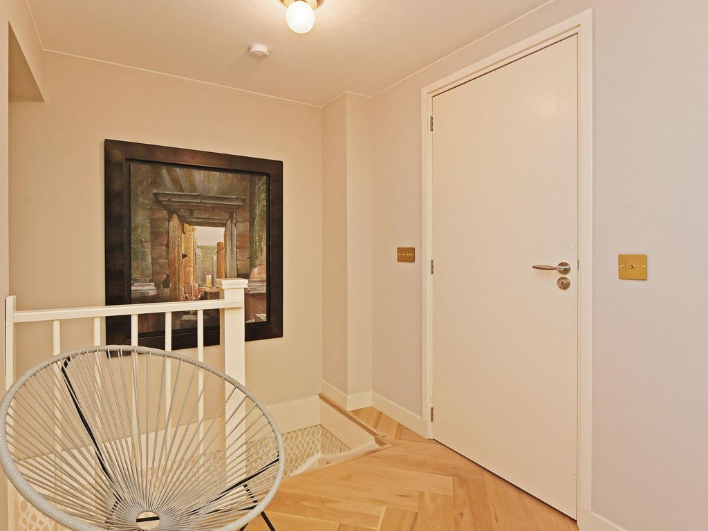Spacious bedroom at the rear with a Juliet balcony and adjoining luxuriously finished bathroom with a bathtub, walk-in shower, extra-wide vanity with vanity, modern wall-hung toilet, and designer radiator. Stairs from the landing lead to the second floor.
